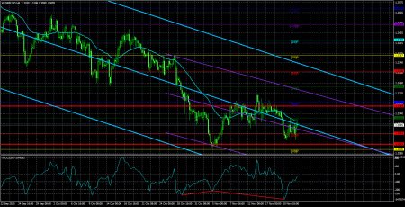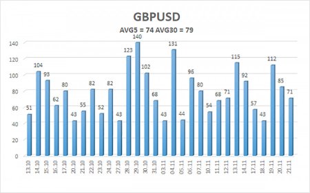 Валютная пара GBP/USD в течение пятницы торговалась преимущественно вбок, несмотря на обилие макроэкономической статистики. Более подробно об этой статистике мы еще поговорим, а в целом техническая и фундаментальная картина по фунту на 80-90% совпадает с евро. Разница заключается лишь в том, что у британской валюты в последние месяцы было чуть больше оснований для падения, чем у евровалюты. А у евровалюты, напомним, их практически не было. В Великобритании все-таки провалилась большая часть важной статистики, а Банк Англии на последнем заседании в году может понизить ключевую ставку, в отличие от ЕЦБ, который свой цикл смягчения уже завершил. Вероятно, именно поэтому британская валюта и упала немного сильнее евро, и покинула боковой канал на дневном ТФ. Так как более сильное падение было в некоторой степенью случайностью, мы продолжаем считать, что все падение GBP/USD в последние месяцы – это коррекция. Коррекция, которая откровенно затянулась, но рынок в любом случае не горит желанием сейчас совершать какие-либо телодвижения. Волатильность упала, если не до минимальных значений, то до достаточно низких. Напомним, что фунт стерлингов исторически более волатильный, чем евро, поэтому 50 пунктов по евро сопоставимы с 70 пунктами по фунту. Что с этой всей информацией делать дальше? Мы остаемся при своем мнении, что восходящий тренд возобновится в любом случае. И когда он возобновится, может наблюдаться обратная текущей картина. Доллар будет падать каждый день, а эксперты вновь будут судорожно придумывать объяснения такому движению, используя любимую фразу «рост рисковых настроений». На самом же деле доллар уже накопил факторов падения пунктов на 700-800, как минимум. Просто маркет-мейкеры еще не завершили формирование своих позиций или же ждут удобного момента для начала нового тренда. Следует признать, что британская экономика действительно выглядит очень слабо. Таковой она является уже лет 10, с тех пор как Британия решила покинуть ЕС. Однако американский фундаментальный фон гораздо важнее британского, хотя бы потому, что американской валюты в мире гораздо больше, чем британской, а сам доллар остается столпом мировой финансовой системы. Его привлекательность падает в тех пор, как президентом США стал Дональд Трамп, но потерять мировое лидерство нельзя за 1 год. Поэтому чем больше негативных новостей будет поступать из-за океана, тем сильнее в перспективе упадет доллар. В краткосрочном плане фунт стерлингов вновь будет пытаться «нащупать дно», от которого можно оттолкнуться. Как мы уже говорили много раз, индикатор уже элементарно устал рисовать «бычьи» дивергенции и посещать область перепроданности. А ведь все это сигналы, указывающие на возобновление восходящего тренда. Таким образом, в ближайшее время мы бы внимательно относились к сигналам о смене тенденции на 4-часовом ТФ. Пара не может корректироваться вечно. Средняя волатильность пары GBP/USD за последние 5 торговых дней составляет 74 пункта, и продолжает падать. Для пары фунт/доллар это значение является «средним». В понедельник, 24 ноября, таким образом, мы ожидаем движения внутри диапазона, ограниченного уровнями 1,3021 и 1,3169. Старший канал линейной регрессии направлен вниз, но только из-за технической коррекции на старших ТФ. Индикатор CCI в шестой раз зашел в область перепроданности з
