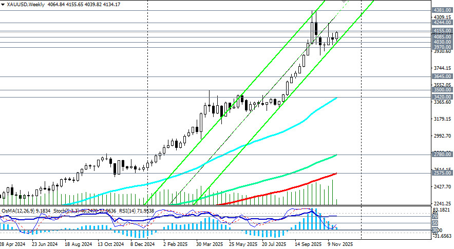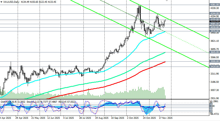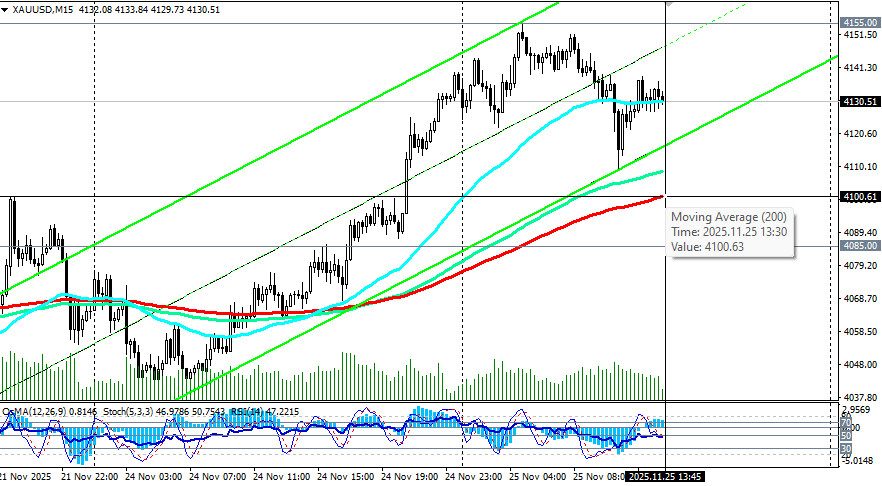 Цена на золото сохраняет бычий уклон, подкрепленный комментариями ФРС и тревожными сигналами международной обстановки. В то же время, доллар, несмотря на повышение вероятности сокращения ставки ФРС в декабре, пока демонстрирует относительную устойчивость, удерживаясь выше «психологической» отметки 100.00. Торговые операции остаются волатильными, поскольку участники рынка продолжают ожидать публикации новых экономических данных, но фундаментальные факторы свидетельствуют о возможности сохранения тенденции ослабления доллара. Меры со стороны ФРС в вопросах монетарной политики останутся, вероятно, определяющим фактором динамики доллара, а также цены на золото, предположили мы в нашем сегодняшнем фундаментальном анализе и обзоре «XAU/USD: «психологическая» отметка 100 и политика ФРС». Между тем, XAU/USD, в целом, сохраняет вчерашние достижения, когда цена в результате вечернего роста преодолела отметку 4138.00. В первые часы азиатской торговой сессии цена обновила 7-дневный максимум, поднявшись к отметке 4155.00, но впоследствии откатилась к текущей отметке 4133.00. Несмотря на сильную коррекцию во второй половине октября, XAU/USD остается в зоне среднесрочного и долгосрочного бычьих рынков, выше ключевых уровней поддержки 35000.00 (ЕМА200 на дневном графике) и 2575.00 (ЕМА200 на недельном графике). Зона поддержки, включающая 3970.00 (50-периодную скользящую среднюю на дневном графике), «круглый» уровень 4000.00, 4030.00 (200-периодную скользящую среднюю на 4-часовом графике), устояла, создав цене опору и фундамент для возобновления роста. Дальнейшее развитие событий вокруг денежно-кредитной политики ФРС и возможных решений относительно финансирования бюджета станут ключевыми факторами, определяющими будущее движение цены на золото. В то же время, сохраняется стабильный восходящий импульс, а цена золота имеет потенциал для роста и достижения новых рекордов. С этой точки зрения, пробой сегодняшнего максимума 4155.00 может стать сигналом для новых длинных позиций с промежуточной целью на локальном уровне сопротивления 4244.00 (максимум месяца). В альтернативном сценарии первым сигналом для возобновления продаж может стать пробой сегодняшнего минимума 4110.00 и 4100.00 («круглая» отметка и ЕМА200 на 15-минутном графике) с целью на «круглом» уровне 4000.00. Его же пробой откроет цене путь к зоне поддержки 3970.00 (ЕМА50 на дневном графике) – 3900.00, вблизи которой, учитывая все же сохраняющийся бычий тренд, возможно построение новых длинных позиций для входа в рынок по более выгодным ценам. В основном же сценарии ожидаем пробой 4155.00 и рост. открыть торговый счет + зарегистрироваться в системе копирования сигналов + инвестировать в ПАММ-системеМатериал предоставлен компанией InstaForex - www.instaforex.com
