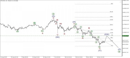 FxSignal 26-11-2025, 20:22 7 Аналитика, прогнозы валютного рынкаПредполагается, что по криптовалютной паре BTC/USD в глобальной перспективе может формироваться крупный бычий импульс (1)-(2)-(3)-(4)-(5). Большая часть указанной фигуры полностью завершена. На текущем графике представлена разметка конечной части крупной коррекции (4), которая завершилась в форме двойного зигзага W-X-Y. После завершения коррекции (4) мы увидели длительный рост в рамках импульсной волны (5), которая до сих пор еще формируется. Импульсная волна (5) завершена на три части из пяти. В ближайшее время ожидается завершение коррекции [4]. Коррекционная волна [4] похожа на тройной зигзаг (W)-(X)-(Y)-(XX)-(Z). Завершены три части - подволны (W)-(X)-(Y). В ближайшее время ожидается рост в подволне (XX) в направлении уровня 98035.00. На указанной отметке величина волны (XX) составит 50% по расширению Фибоначчи от волны (Y). После завершения коррекционной волны [4], участников рынка ждет рост криптовалюты в рамках волны [5] в направлении максимума 126147.81. На указанном уровне ранее была завершена импульсная волна [3]. В текущей ситуации можно рассматривать открытие длинных позиций. Торговые рекомендации: Buy 87553.47 takeprofit 98035.00.