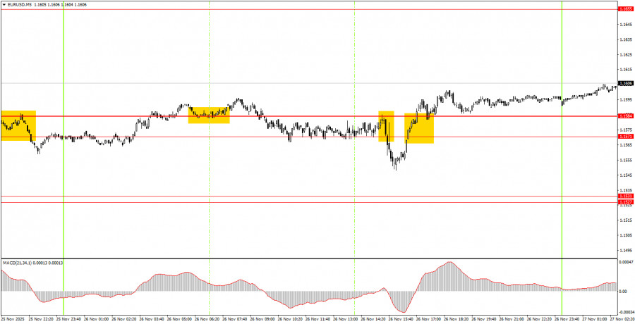 На часовом таймфрейме пара EUR/USD приступила к очередной попытке восхождения. Общий фундаментальный и макроэкономический фон остается для доллара США очень слабым, таким образом, европейская валюта по-прежнему может показывать падение только на технических основаниях – флэт на дневном ТФ остается актуальным. Однако мы ждем его завершения и возобновления восходящего тренда 2025 года. В четверг начинающие трейдеры могут вновь торговать от области 1,1571-1,1584. Закрепление цены выше этой области позволяло открывать длинные позиции с целью 1,1655-1,1666. Новый отскок от этой области позволит еще раз открывать лонги. Закрепление цены ниже этой области сделает актуальными короткие позиции с целью 1,1531. На 5-минутном ТФ следует рассматривать уровни 1,1354-1,1363, 1,1413, 1,1455-1,1474, 1,1527-1,1531, 1,1571-1,1584, 1,1655-1,1666, 1,1745-1,1754, 1,1808, 1,1851, 1,1908, 1,1970-1,1988. На четверг в Евросоюзе и США не запланировано ни одного важного события. Таким образом, волатильность сегодня может быть низкой, но пара может продолжить поступательное движение вверх.Основные правила торговой системы: