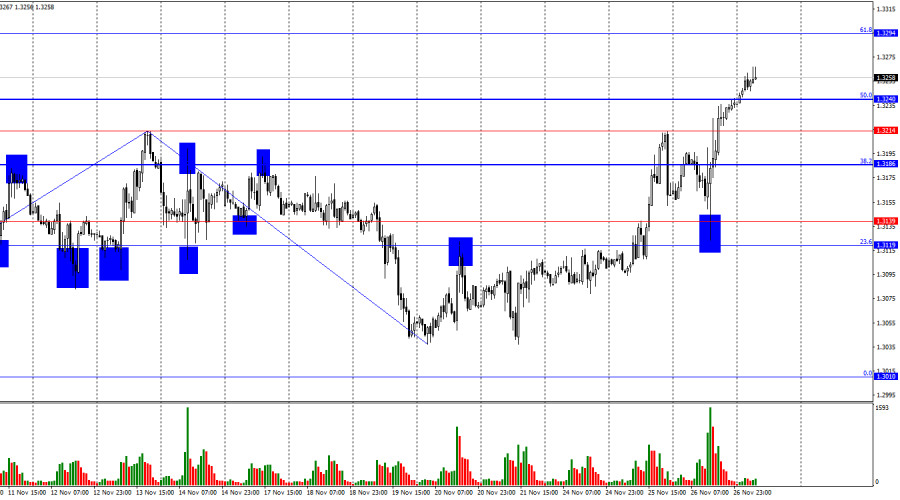 Настроение категории трейдеров «Non-commercial» за последнюю отчетную неделю стало более «бычьим», но эта отчетная неделя была полтора месяца назад – от 7 октября. Количество Long-контрактов на руках спекулянтов выросло на 13871 единицу, а количество Short – на 9453 единиц. Разрыв между количеством Long и Short-контрактов сейчас фактически следующий: 94 тысячи против 98 тысяч. Практически полное равенство. На мой взгляд, британец по-прежнему выглядит менее «опасным», чем доллар. В краткосрочном плане американская валюта пользуется спросом на рынке, но я считаю, что это временное явление. Политика Дональда Трампа привела к резкому падению рынка труда, а ФРС вынуждена проводить смягчение ДКП, чтобы остановить рост безработицы и стимулировать создание новых рабочих мест. Таким образом, если Банк Англии может понизить ставку еще один раз, то FOMC может продолжать смягчение весь 2026 год. Доллар по итогам 2025 года сильно ослаб, но 2026 год может быть для него ничем не лучше. Календарь новостей для США и Великобритании: 27 ноября календарь экономических событий не содержит в себе ни одной интересной записи. Влияние информационного фона на настроение рынка в четверг будет отсутствовать. Прогноз по GBP/USD и советы трейдерам: Продажи пары возможны сегодня при отбое котировок от уровня 1,3294 на часовом графике с целями 1,3240 и 1,3214. Покупки можно было открывать вчера при закреплении цены над уровнем 1,3214 с целями 1,3240 и 1,3294 или при отбое от зоны 1,3119–1,3139 с теми же целями. Сегодня сделки на покупку можно держать открытыми до закрытия цены под уровнем 1,3240. Сетки уровней Фибоначчи построены по 1,3470–1,3010 на часовом графике и по 1,3431–1,2104 на 4-часовом.Материал предоставлен компанией InstaForex - www.instaforex.com