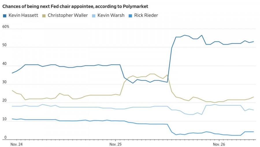 После того как Резервный банк Новой Зеландии снизил cash rate, он включил «ястребиную» риторику. Вероятнее всего, цикл монетарной экспансии закончен. То же самое можно сказать про ЕЦБ. Ускорение австралийской инфляции до 3,3% дает повод для слухов об ужесточении денежно-кредитной политики RBA. Не отказывается от нормализации Банк Японии. Проект бюджета Рэйчел Ривз снижает вероятность активных действий Банка Англии в конце 2025. ФРС придется чуть не в одиночку снижать ставки, в то время как остальные центробанки будут их удерживать или даже повышать. Крайне неприятная новость для доллара США. Тем более, что срочный рынок наращивает предполагаемые масштабы монетарной экспансии по мере роста шансов, что Кевин Хассет возглавит Федрезерв. Если в составе FOMC появится еще такой же «голубь» как Стивен Миран, пиши пропало. Динамика шансов кандидатов на кресло председателя ФРС