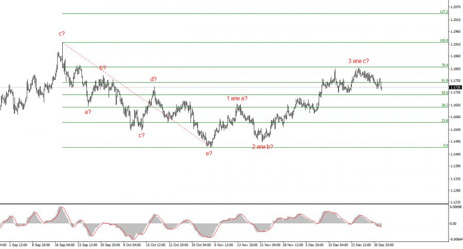 Курс инструмента EUR/USD в течение пятницы снизился на 10 базовых пунктов, хотя в течение дня движения были достаточно активные. Впрочем, не настолько активные, чтобы делать вывод о завершении праздников. Вероятнее всего, рынок возьмется за дело уже в понедельник, когда начнут выходить первые отчеты в этом году. Сегодня же участники рынка могут со спокойной совестью продолжать отдыхать, доедать оливье, допивать шампанское. Новостной фон отсутствует, поэтому я не связываю движения новогодней недели с какими-либо событиями. Просто потому, что их нет. На мой взгляд, инструмент сейчас движется исключительно по волнам, что хорошо видно даже начинающим трейдерам. Любой трейдер знает, что классическая импульсная(трендовая) структура – это пять волн. Классическая коррекционная структура – это три волны. В рамках локальной волны 3 или с мы увидели пять волн, поэтому сейчас в любом случае следует ожидать падения. Если повышательный набор волн, берущий свое начало 5 ноября, не завершен и примет пятиволновой вид, тогда после коррекции мы увидим новое повышение котировок. Лично я поддерживаю этот сценарий. Однако есть и другой. Повышательный набор волн ограничится тремя волнами, что сделает его еще одним коррекционным участком, которые, по большому счету, продолжают чередоваться уже полгода. Безусловно, многое будет зависеть от новостного фона на следующей неделе, так как следующая неделя – первая рабочая в 2026 году, поэтому в Америке выйдут отчеты по безработице, пэйроллам, заработным платам и деловой активности. Эти отчеты могут вызвать реакцию как у покупателей, так и у продавцов, так как экономическая отчетность в США по-прежнему имеет сильное влияние на денежно-кредитную политику FOMC.Общие выводы