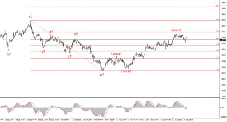 Волновая картина инструмента GBP/USD видоизменилась. Понижательная коррекционная структура a-b-c-d-e в C в 4 носит завершенный вид, как и вся волна 4. Если это действительно так, я ожидаю, что основной участок тренда возобновит свое построение с первоначальными целями около 38 и 40 фигур. В краткосрочном плане я ожидал построение волны 3 или с с целями, расположенными около отметок 1,3280 и 1,3360, что приравнивается к 76,4% и 61,8% по Фибоначчи. Эти цели достигнуты. Волна 3 или с предположительно завершила свое построение, поэтому в ближайшее время может наблюдаться построение понижательной волны или набора волн.Основные принципы моего анализа: