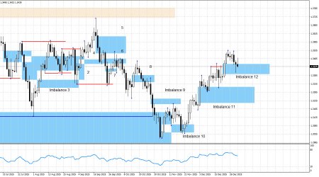 Пара GBP/USD выполнила возврат в «бычий» имбаланс 12 и теперь от обеих валютных пар (EUR/USD и GBP/USD) следует ожидать реакции на «бычьи» паттерны. Таким образом, несмотря на падение котировок британца в последние несколько дней, «бычий» тренд сохраняется, а быки продолжают доминировать на рынке. Об инвалидации имбаланса 12 речи пока не идет, а коррекционные откаты бывают разные по размеру. Я не вижу даже ничего страшного в том, если британец выполнит падение обратно к имбалансу 11, произведет съем ликвидности со свингов от 9 декабря и 17 декабря, а затем начнет новый процесс роста.
