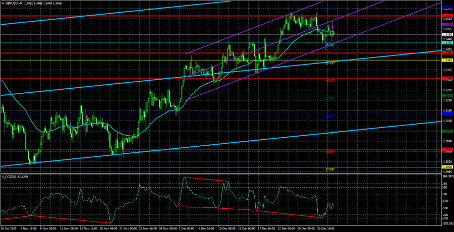 Валютная пара GBP/USD в пятницу торговалась в разные стороны с пониженной волатильностью. Среднее значение волатильности за последние полтора месяца – 75 пунктов, и это значение является достаточно низким. В пятницу волатильность была еще ниже. Однако праздники закончились, а трейдеры на этой неделе сразу же попадут в водоворот событий. Начать следует с событий в Венесуэле, которые произошли в субботу. Трамп, «который всегда сдает назад», на этот раз перешел от слов к делу и отдал приказ о бомбардировке Каракаса и других городов Венесуэлы. Напомним, что два месяца президент США требовал от президента Венесуэлы Николаса Мадуро подать в отставку, предупреждая, что в противном случае Штаты будут вынуждены вмешаться. Трамп обвиняет Мадуро в покровительстве наркотраффика и терроризме, из-за которых страдает Америка. В ходе специальной военной операции Мадуро был захвачен американскими военными и депортирован в США, где должен предстать перед судом. Честно говоря, сложно сказать, как отреагирует рынок на это событие сегодня, но реакция может быть достаточно сильной. Доллар вполне может укрепить свои позиции, но надолго ли? В Великобритании на следующей неделе важных событий и публикаций будет «кот наплакал». Зато в США... Первая рабочая неделя месяца означает, что будут опубликованы данные по рынку труда и безработице, от которых трейдеры сейчас и отталкиваются в своей торговле в первую очередь. Однако, помимо этих данных, будут и другие важные отчеты, которые игнорировать не стоит. В понедельник будет опубликован индекс деловой активности ISM в секторе производства, который рискует остаться ниже «ватерлинии» по итогам декабря. В среду будут опубликованы отчеты JOLTs, ADP и ISM для сектора услуг. Отчет JOLTs вряд ли спровоцирует сильную реакцию рынка, так как крайне пространно отражает состояние рынка труда США. Отчет ADP является чуть более важным, вряд ли покажет сильное значение(судя по прогнозам), а индекс деловой активности ISM может снизиться по итогам декабря с 52,6 до 52,3 пунктов. В пятницу будут опубликованы отчеты NonFarm Payrolls и уровень безработицы за декабрь, а также индекс настроения потребителей от университета Мичиган. Рынок ожидает, что количество созданных рабочих мест вне сельскохозяйственного сектора окажется ниже, чем в ноябре, а уровень безработицы останется без изменений на 4,6%. Однако хотим напомнить, что 60 тысяч новых рабочих мест – это очень мало для того, чтобы считать рынок труда США «восстанавливающимся». Таким образом, в течение всей текущей недели доллар, скорее, будет падать, чем расти. В целом, именно это и нужно, так как техническая картина продолжает указывать на восходящий тренд, а с провальными данными из США расти обеим валютным парам будет гораздо проще. Но в то же время напоминаем, что прогнозы – это всего лишь прогнозы, а реальные значения отчетов нередко кардинальным образом отличаются от них. Средняя волатильность пары GBP/USD за последние 5 торговых дней составляет 64 пункта. Для пары фунт/доллар это значение является «средне-низким». В понедельник, 5 января, таким образом, мы ожидаем движения внутри диапазона, ограниченного уровнями 1,3392 и 1,3520. Старший канал линейной регрессии развернулся вверх, что указывает на восстановление тренда. Индикатор CCI шесть раз заходил в область перепроданности за последние месяцы и 