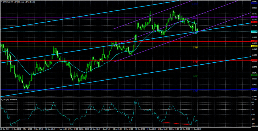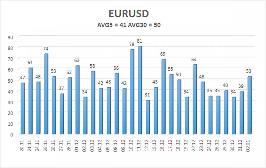 Валютная пара EUR/USD в течение пятницы вновь торговалась достаточно слабо, так как 53 пункта волатильности – это мало даже для евровалюты. По сути, в пятницу рынок продолжал отдыхать и праздновать, но уже сегодня нормальная работа рынка должна восстановиться. Правда, это не означает, что волатильность тут же подскочит вверх. Напомним, что рынок торговал крайне неохотно не только в течение рождественской и новогодней недели. Он торгует очень вяло уже несколько месяцев подряд. Однако и в этом нет ничего удивительного, так как на дневном ТФ уже 6 месяцев подряд наблюдается флэт, который и объясняет слабое желание трейдеров открывать сделки. Также хотим напомнить, что в декабре важных новостей, событий и публикаций было огромное количество, однако активнее пара EUR/USD двигаться не стала, а покинуть флэт не сумела. Поэтому движения цены на этой неделе будут в первую очередь зависеть от самих трейдеров, а не от макроэкономического фона. Макроэкономический фон – это лишь триггер для трейдеров. Отрабатывать его или нет, и с какой силой – решать рынку. Тем не менее, закрывать глаза на макроэкономические события тоже не стоит. В Евросоюзе на этой неделе будут опубликованы отчеты по инфляции, деловой активности и безработице. Эти отчеты мы не считаем важными в текущих обстоятельствах, так как рынок продолжает быть полностью сосредоточенным на американских отчетах по рынку труда, безработице и инфляции. К ЕЦБ вопросов у трейдеров сейчас нет никаких. Инфляция в ЕС стабильно находится около 2%, экономика растет умеренными темпами, ЕЦБ не имеет никаких оснований для изменения ключевой ставки в ближайшее время. Поэтому реакция на все опубликованные в Евросоюзе данные может быть крайне слабой. Тем более, что на этой неделе выйдут важные данные в США, и рынок в первую очередь будет отрабатывать их. Об американской статистике мы еще поговорим в статье по GBP/USD, а в этой статье лишний раз напомним трейдерам о том, что, с технической точки зрения, пара вполне может начать падение к уровню 1,1400. Боковой канал у нас ограничен уровнями 1,1400 и 1,1830 и так как за последние две недели преодолеть уровень 1,1830 не получилось, может начаться падение евровалюты и, соответственно, рост доллара, для чего не нужны соответствующие макроэкономические данные. Поэтому доллар может расти в ближайшие недели даже с плохими новостями из-за океана. А сами новости не следует выворачивать наизнанку, чтобы хоть как-то объяснить очередное алогичное движение на рынке. Однако есть и другой вариант развития событий. Если американская статистика провалится, рынок может предпринять новую попытку преодоления уровня 1,1830. Если она окажется удачной, флэт будет завершен, а мы увидим долгожданное возобновление восходящего тренда 2025 года. Средняя волатильность валютной пары EUR/USD за последние 5 торговых дней по состоянию на 5 января составляет 41 пункт и характеризуется, как «низкая». Мы ожидаем движение пары между уровнями 1,1678 и 1,1760 в понедельник. Старший канал линейной регрессии разворачивается вверх, но по факту все еще продолжается флэт на дневном ТФ. Индикатор CCI заходил в начале декабря в область перекупленности, но небольшой откат мы уже увидели. На прошлой неделе была сформирована «бычья» дивергенция, которая указывает на возобновление восходящего тренда. Ближайшие уровни поддержки: S1 