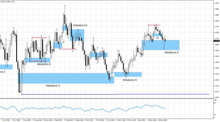 Пара EUR/USD в понедельник выполнила сильное падение на дно имбаланса 9, но к концу дня вернулась на уровни открытия дня. В свечном анализе такая формация называется «Молот», и она является предвестником разворота. Было бы лучше, если бы этот «Молот» параллельно произвел съем ликвидности со значимого свинга. Но значимых свингов в зоне имбаланса 9 нет. Таким образом, я продолжаю ждать «бычьей» реакции на имбаланс 9. Напомню, что один имбаланс может быть отработан несколько раз. Правила системы «Smart money» не запрещают этого. Лично я стараюсь использовать лишь первую реакцию в торговле, но исключения бывают в любом правиле. Таким образом, спасти быков могут только сами быки, и сделать это нужно максимально быстро – на этой неделе. Если быки смогут восстановить позиции евровалюты, тогда можно будет считать отработку имбаланса 9 двойной.