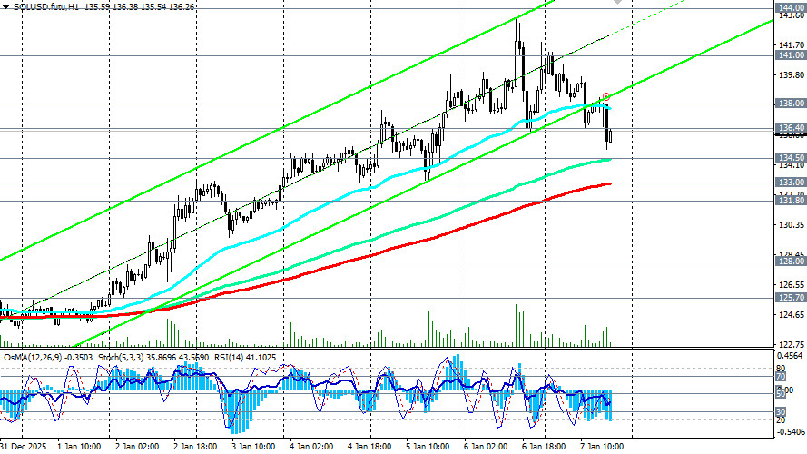 Доллар не смог воспользоваться этими умеренно-позитивными, но противоречивыми данными. Несмотря на общий умеренный рост экономических показателей, ввиду сохраняющихся ожиданий постепенного смягчения денежно-кредитной политики ФРС американская валюта осталась под давлением, а индекс доллара USDX – в зоне ниже важных уровней сопротивления 98.62 (ЕМА200 на 4-часовом графике), 98.67 (ЕМА50 на дневном графике), также оставаясь на уровне цены открытия сегодняшнего торгового дня и отметки 98.56 (см. наш сегодняшний обзор «Доллар: ADP, PMI ISM, JOLTS, NFP – до и после»). В то же время несмотря на то, что индекс «страха и жадности» переместился сегодня в нейтральную зону (52 из 100), инвесторы сегодня предпочитают выходить из рискованных активов крипторынка, отметили мы в нашем сегодняшнем обзоре XRP/USD: сценарии динамики на 07.01.2026. Что касается другого альткоина из топ-10 солана и пары SOL/USD, то сегодня она вслед за биткоином и другими основными альткоинами продолжает снижаться, двигаясь зоне медвежьего рынка, среднесрочного – ниже ключевого уровня сопротивления 162.00 (ЕМА200 на дневном графике) и долгосрочного – ниже ключевого уровня сопротивления 138.00 (ЕМА200 на недельном графике).Пробой сегодняшнего минимума 135.15 может спровоцировать дальнейшее снижение в сторону важных краткосрочных уровней поддержки 133.00 (ЕМА200 на 1-часовом графике), 133.80 (ЕМА200 на 4-часовом графике). Далее – смотрим по ситуации. В случае же возобновления снижения доллара и более устойчивого интереса инвесторов к покупкам рискованных и альтернативных доллару активов, пробой зоны сопротивления 137.00 - 138.00 может стать первым сигналом для возобновления покупок с целями на ключевых среднесрочных уровнях сопротивления 157.00 (ЕМА144 на дневном графике), 162.00. Для окончательного же возрождения восходящей динамики цене необходимо будет преодолеть ключевой уровень сопротивления 162.00 (ЕМА200 на дневном графике). Пока же фундаментальный фон и настроения на рынках создают предпосылки для дальнейшего снижения. Поэтому в основном сценарии ожидаем дальнейшее снижение. Уровни поддержки: 134.50, 133.00, 131.80, 128.00, 125.70, 119.00 Уровни сопротивления: 136.40, 138.00, 141.00, 144.00, 150.00, 157.00, 160.00, 162.00 Торговые сценарии