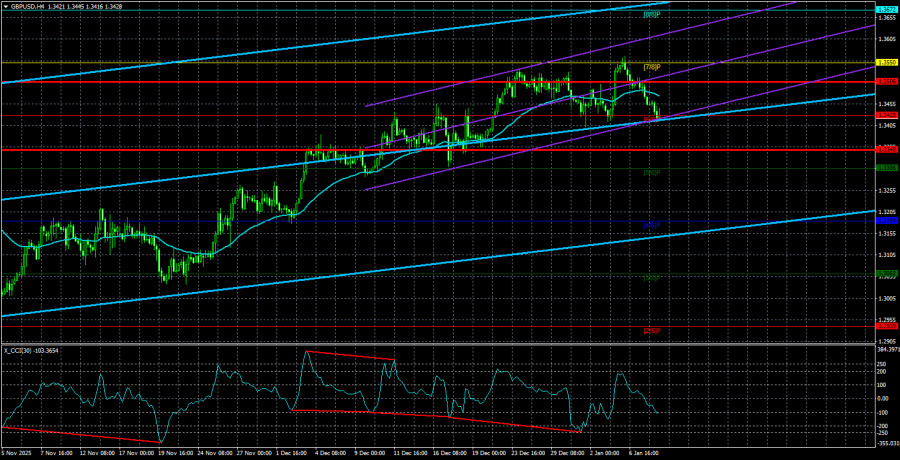 Валютная пара GBP/USD в четверг продолжала торговаться с нисходящим уклоном и слабой волатильностью. Макроэкономический фон в этот день отсутствовал, а Дональд Трамп не успел пока провести еще одну военную операцию. Доллар планомерно растет, но что это: начало новой безосновательной тенденции или просто очередная коррекция? Многие трейдеры считают, что пятница расставит точки над «i». Мы считаем, что нет. Отчеты NonFarm Payrolls и уровень безработицы, конечно, очень важны, но они, скорее, окажут долгосрочное воздействие на доллар США. Сегодня мы можем увидеть резкий всплеск эмоций в начале американской торговой сессии, но чего ожидать от самих отчетов? Мы считаем, что мало кто верит в то, что уровень безработицы снизится, а количество Нонфармов вырастет в декабре до 150-200 тысяч. А именно такие значения можно будет считать позитивными. Но в то же время для роста американской валюты будет достаточно и посредственных значений. К примеру, уровень безработицы не изменится, а количество Нонфармов составит примерно 80 тысяч при прогнозах около 60. Можно ли будет считать такую статистику позитивной? Нет, потому что 80 тысяч – это все равно очень мало. NonFarm Payrolls – это не тот показатель, где любое значение выше нуля или выше прогноза считается положительным. Однако рынок может отреагировать как раз на мнимую позитивность. Если прогноз превышен, значит уже наблюдается положительная динамика. Поэтому доллар может показать рост даже на слабых значениях обоих отчетов. Главное, чтобы фактические значения оказались лучше прогнозов. А вот как повлияют опубликованные сегодня отчеты на планы ФРС по монетарной политике? Мы считаем, что чем слабее будут данные за декабрь, тем выше вероятность более, чем одного, снижения ключевой ставки в 2026 году. Если рынок труда не восстанавливается, не создает достаточно рабочих мест, значит ФРС придется снижать ключевой ставку и никак иначе. Таким образом, в моменте американская валюта может вырасти, но в среднесрочной перспективе продолжит снижение. Особенно против европейской валюты, чей центральный банк с крайне низкой степенью вероятности понизит хотя бы один раз ставки в 2026 году. Против британского фунта – другое дело, так как Банк Англии тоже продолжает смягчение политики. Но, с нашей точки зрения, даже этот фактор не спасет доллар от «фактора Трампа». Если мы ошибаемся на счет разрушительного влияния «фактора Трампа» на доллар, на дневном ТФ должны появиться новые признаки нисходящей тенденции или тренда. А фунт стерлингов не так давно закрепился выше линий Киджун-сен и Сенкоу Спан Б, что открывает ему перспективы для восходящего тренда. Точнее для возобновления восходящего тренда 2025 года. Мы по-прежнему настроены крайне скептически к любому росту доллара, но готовы реагировать на любые изменения в фундаментальном фоне и конъюнктуре рынка. Средняя волатильность пары GBP/USD за последние 5 торговых дней составляет 79 пунктов. Для пары фунт/доллар это значение является «средним». В пятницу, 9 января, таким образом, мы ожидаем движения внутри диапазона, ограниченного уровнями 1,3348 и 1,3506. Старший канал линейной регрессии развернулся вверх, что указывает на восстановление тренда. Индикатор CCI шесть раз заходил в область перепроданности за последние месяцы и сформировал множество «бычьих» дивергенций, что постоянно преду