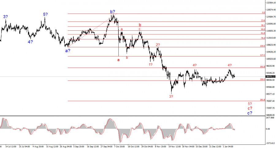 Исходя из проведенного анализа BTC/USD, я считаю, что построение понижательного участка тренда будет продолжено. Текущий коррекционный набор волн может принять достаточно протяженный вид, поэтому в ближайшее время я не жду его завершения. Биткоин четырежды не сумел преодолеть отметку 122000$, каждый подход к ней сопровождался довольно сильным откатом. Исходя из всего вышесказанного, я ожидаю построения волны 5 в с в с с целями, расположенными около отметки 76500$, что соответствует 261,8% по Фибоначчи, и ниже, и остаюсь в продажах.Основные принципы моего анализа: