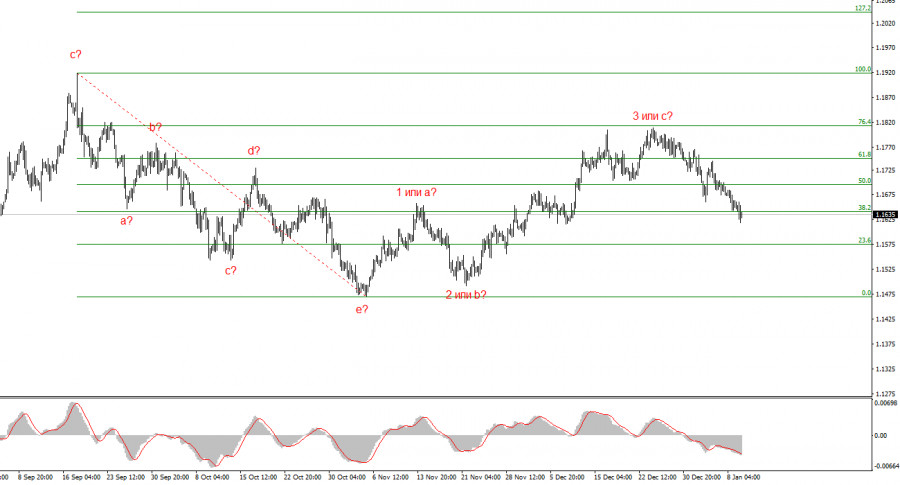 Европейская валюта снижается против доллара три недели подряд. Снижение инструмента EUR/USD началось точно на Рождество и с тех пор не прекращается. Чем оно обусловлено? На мой взгляд, исключительно волновой разметкой. На праздники никаких новостей не было ни в США, ни в Европейском союзе, а снижение инструмента можно посчитать обычным шумом на рынке. Однако праздники закончились, а снижение продолжалось. На прошлой неделе новостной фон вряд ли способствовал укреплению американской валюты, так как большая часть отчетов из Америки разочаровала. И самое сложное в текущей ситуации – как раз сопоставить новостной фон с движениями инструмента. Доллар США крепчает на так сильно, чтобы можно было говорить о реакции рынка на военные действия и угрозы Трампа. А новостной фон, на мой взгляд, для американской валюты слабый, чтобы рынок повышал спрос на него. Исходя из этого, я считаю, что инструмент начал построение коррекционной волны или набора волн, и волны будут определять дальнейшую динамику. На следующей неделе новостей в Евросоюзе – «кот наплакал». Первый отчет выйдет в четверг, рынок узнает объемы промышленного производства в Европе по итогам ноября. Также в этот день выйдет итоговый ВВП Германии за 2025 год. Эти два отчета, по большому счету, являются единственными в Еврозоне на следующей неделе. Что от промышленного производства ЕС, что от немецкого ВВП мне сложно ждать позитивных значений. Я считаю, что участники рынка, если и обращают в данное время внимание на новости и экономические данные(что сложно сказать, наблюдая минимальную амплитуду движений каждый день), то по большей части на американские. А их очень сложно трактовать однозначно.