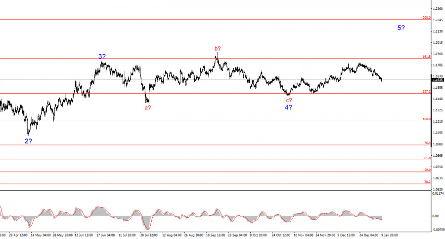 Британская валюта в праздничные недели пользовалась большей благосклонностью рынка и сумела избежать сильного снижения. Я не могу сказать, что новостной фон для евро и фунта в последние три недели кардинально отличался, но все же спрос на евро снижается уже три недели, а на фунт стерлингов – всего несколько дней. Поэтому различия в восприятии рынком новостей и событий все же есть. Тем не менее, волновые разметки инструментов EUR/USD и GBP/USD практически полностью совпадают. Присутствуют лишь незначительные отличия. В обоих случаях были построены трехволновые повышательные структуры, которые могут быть началом нового длительного глобального восходящего тренда, а могут быть частью коррекционной структуры второй половины 2025 года. Так или иначе, в ближайшее время коррекционная волна(волны) могут продолжать построение, а новостной фон не воспринимается в данное время рынком на полную силу. В Великобритании на следующей неделе экономических публикаций будет немногим больше, чем на неделе текущей. А в течение текущей недели их было ноль. Лишь в четверг выйдут отчеты по ВВП и промышленному производству за ноябрь. Напомню, что отчеты по ВВП достаточно редко отклоняются от ожиданий рынка больше, чем на 0,1%, и, как следствие, редко вызывают реакцию рынка. А месячные отчеты – гораздо менее важны для трейдеров, чем квартальные и годовые. Промышленное производство в Британии может увеличиться в объемах на 0,1% в месячном исчислении, но в фокусе рынка сейчас находится только Дональд Трамп. По крайней мере, я не заметил на прошлой неделе бурной реакции рынка на отчеты ADP, JOLTS, индексы ISM, Nonfarm Payrolls и уровень безработицы, которые определяют судьбу денежно-кредитной политики ФРС. Активность рынка после праздников остается достаточно низкой.