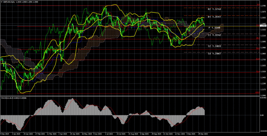 Валютная пара GBP/USD на прошлой неделе потеряла всего лишь 50 пунктов и чувствовала себя увереннее пары EUR/USD. Понедельник спас британский фунт от более сильного падения. Напомним, что в понедельник рынок как раз отрабатывал вторжение Трампа в Венесуэлу и захват президента этой страны, а также очередной «прекрасный» отчет из США – индекс деловой активности в секторе производства. Именно в этот день «безопасный» доллар США потерял около 100 пунктов, а волатильность была наивысшей. Таким образом, мы по-прежнему считаем, что геополитика не будет способствовать укреплению американской валюты. На прошлой неделе в Штатах были опубликованы индексы деловой активности ISM, отчеты ADP и JOLTs, NonFarm Payrolls и уровень безработицы. Какие выводы мы можем сделать на основании этой информации? Деловая активность в производстве падает, в секторе услуг растет. Количество вакансий сокращается, занятость в частном секторе снижается, новых рабочих мест создается недостаточно для отсутствия роста безработицы. Безработица... не снижается. Последнее заявление требует разъяснения. Декабрьский отчет по безработице показал ее замедление на 0,1%, но стоит ли относится к этому, как к замедлению? Мы считаем, что нет. Уровень безработицы в Штатах растет три года, поэтому однократное падение на 0,1% – это просто шум или коррекция. В моменте доллар мог получить поддержку, но рынок прекрасно понимает, что если рабочие места создаются в недостаточном объеме, то за счет чего безработице снижаться? Поэтому к укреплению доллара на прошлой неделе мы относимся, как к банальной технической коррекции. Цена на дневном ТФ преодолела важные линии Сенкоу Спан Б и Киджун-сен, а в рамках коррекции вернулась к ним. Таким образом, тенденция по индикатору Ишимоку – восходящая. До тех пор, пока британский фунт располагается выше указанных линий, перспективы роста остаются высокими. И никакая геополитика не заставит рынок покупать доллар, который теперь сам является «участником» военных конфликтов. На этой неделе в США и Великобритании будет несколько важных публикаций, но мы хотим сосредоточить внимание трейдеров только на одной – инфляции за декабрь. В ноябре индекс потребительских цен неожиданно замедлился до 2,7%, что большинство экспертов тут же объяснило «черной пятницей». Поэтому, если в декабре инфляция продолжит снижение, для доллара это будет приговор, так как ФРС в этом случае нет никакой нужды удерживать ключевую ставку на текущем значении при плачевном состоянии рынка труда. Если же инфляция вырастет(что гораздо более вероятно), особых дивидендов доллар из этого не извлечет, потому что в данное время рынок и без этого не ждет от ФедРезерва активных «голубиных» действий в ближайшие несколько месяцев. Мы считаем, что любое падение пары – априори коррекционное. Конечно, это не означает, что доллар не может расти в принципе, но в среднесрочном плане мы все также ожидаем только его падения. Средняя волатильность пары GBP/USD за последние 5 торговых дней составляет 77 пунктов. Для пары фунт/доллар это значение является «средним». В понедельник, 12 января, таким образом, мы ожидаем движения внутри диапазона, ограниченного уровнями 1,3323 и 1,3477. Старший канал линейной регрессии развернулся вверх, что указывает на восстановление тренда. Индикатор CCI шесть раз заходил в область перепроданнос