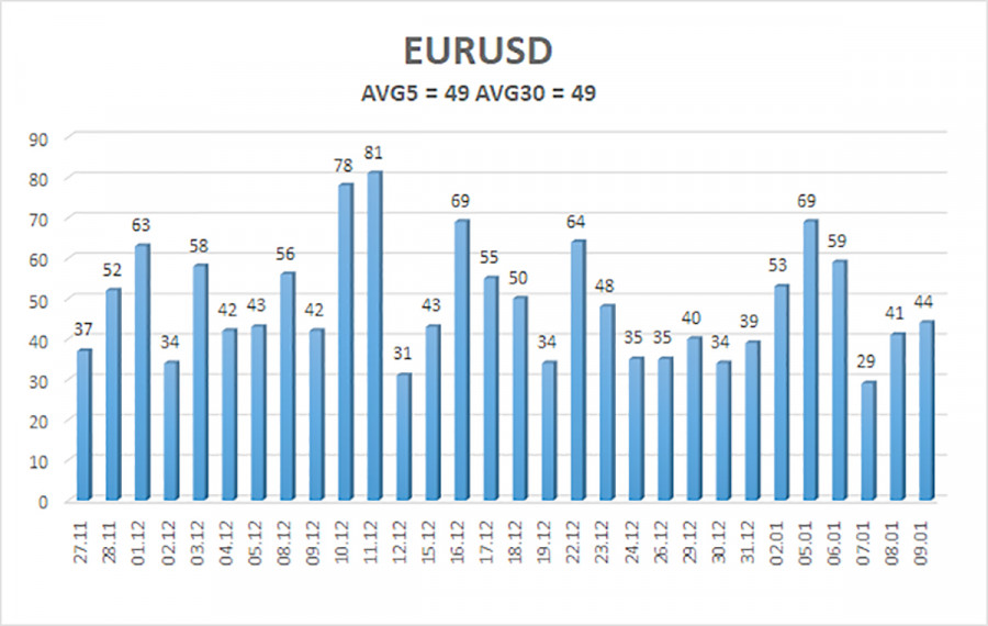 Валютная пара EUR/USD в течение прошедшей недели умудрилась потерять 90 пунктов. То есть американский доллар вырос против евровалюты почти на 1 цент. Логично ли это? Справедливо ли это? Мы считаем, что вполне. Однако не из-за геополитики, воинственных действий и угроз Дональда Трампа или «скрытого позитива» макроэкономической статистики в США. Начать следует с геополитики. Мы по-прежнему считаем, что доллар при Дональде Трампе не может считаться «защитным активом». Давайте вспомним, что в период с 2008 года по 2022 американская валюта неизменно росла. За этот период времени курс пары EUR/USD снизился с 1,6 до 1,0. Таким образом, «защитный доллар» было не столько защитным, сколько выгодным. Инвесторы понимали, что доллар растет, поэтому его выгодно покупать для любых целей. Из-за этого и спрос на него рос при любом геополитическом конфликте. В 2022 году ситуация резко изменилась. Инфляция в Америке достигла максимальных отметок за последние десятилетия, а ФРС довела ключевую ставку до «супер-ограничительных» значений. Как только инфляция начала замедляться, доллар начал падать, так как рынок начал ожидать смягчения монетарной политики ФРС. Под влиянием будущего снижения ключевой ставки доллар снизился с 0,96$ за 1 евро до 1,11$. Ну а затем во второй раз президентом США стал Дональд Трамп. В январе 2025 года цена опускалась в рамках коррекции до значения 1,02$, но Трамп очень быстро исправил этот пробел при помощи торговой войны, которая резко снизила желание инвесторов иметь дело с долларом. Начался 2026 год, Трамп решил не только пересмотреть торговые условия США с половиной стран мира, но и установить контроль над некоторыми из них. Теперь под угрозой находятся Венесуэла, Мексика, Куба, Иран и даже Гренландия. Политика протекционизма перерастает в диктаторство. На наш взгляд, ничем хорошим для доллара это не закончится. В целом, пара EUR/USD уже шесть месяцев торгуется в боковом канале 1,1400-1,1830, и мы считаем, что именно этот фактор определяет движение цены. Посудите сами, цена достигла верхней границы бокового канал и начала падение. Логично? Да. Количество и степень значимости макроэкономического фона из США на прошлой неделе зашкаливали, но ниже на иллюстрации волатильности вы можете увидеть, как рынок торговал в эти дни. В среднем на 49 пунктов в день. Почему если рынок скупает доллар на фоне геополитической напряженности, доллар растет так слабо, а движений на рынке практически нет? Почему важнейшая макроэкономическая информация не спровоцировала привычные «полеты» на 80-100 пунктов? Потому что флэт, и геополитика с макроэкономикой не имеют практически никакого значения в данное время. Если же разобрать на макроэкономические данные, то доллар, скорее, должен был упасть, чем вырасти. Но на рынке флэт, поэтому технические факторы стоят на первом месте. Мы считаем, что американская валюта в ближайшие недели может и дальше потихоньку расти лишь потому, что пара на технических факторах будет двигаться в направлении уровня 1,1400(нижняя граница флэта). Средняя волатильность валютной пары EUR/USD за последние 5 торговых дней по состоянию на 12 января составляет 49 пунктов и характеризуется, как «низкая». Мы ожидаем движение пары между уровнями 1,1586 и 1,1684 в понедельник. Старший канал линейной регрессии направлен вверх, но по факту все еще продолжается флэт на дневном ТФ. Инд