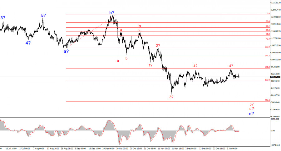 Биткоин предположительно усложнил коррекционную волну 4, которая приняла достаточно протяженный трехволновой вид. В этом случае ее построение может быть завершено. На старшем масштабе продолжает построение понижательная коррекционная структура a-b-c, которая легко может трансформироваться в полноценный импульсный участок тренда. Напомню, что пик волны b этой структуры вышел за пик последней волны предыдущего повышательного участка тренда, чего в классическом волновом анализе быть не может. Однако я продолжаю настаивать на том, что нужно быть более гибкими при определении волн и волновых структур. В ближайшее время рынок может начать построение предполагаемой волны 5 в с в с, лоу которой должен находиться ниже отметки 80500$. Основатель SkyBridge Capital Энтони Скарамуччи заявил на прошлой неделе, что 2026 год может стать позитивным для биткоина. По мнению Скарамуччи, негативное настроение рынка и падение интереса со стороны инвесторов – это сигнал к возможному росту. Г-н Скарамуччи считает, что динамика биткоина в текущему году будет зависеть от макроэкономических процессов, которые будут способствовать росту цифровых активов. Основатель SkyBridge Capital считает, что инфляция в США будет продолжать замедляться, что даст возможность ФРС продолжить снижение процентной ставки. Также эксперт считает, что новый директор ФРС будет куда более снисходителен к требованиям Трампа понизить процентную ставку, что откроет биткоину дополнительное окно возможностей. Скарамуччи ожидает, что в 2026 году биткоин установит новый ценовой рекорд. Лично я не будут спорить с главой инвестиционной компании, но в то же время четко следую текущей волновой картине. Если текущая волновая разметка начнет ломаться, я рассмотрю сценарий с построением нового повышательного участка тренда. На мой взгляд, в данное время мы видим коррекционную структуру в рамках понижательного тренда, который еще не завершен.