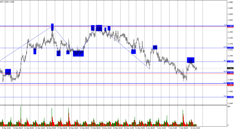 В течение последней отчетной недели профессиональные игроки открыли 3515 Long-контрактов и закрыли 1832 контракта Short. Настроение группы «Non-commercial» остается «бычьим» благодаря Дональду Трампу и его политике, и только усиливается с течением времени. Общее количество контрактов Long, сосредоточенных на руках спекулянтов, теперь составляет 298 тысяч, а контрактов Short – 135 тысяч. Это более, чем двукратное преимущество быков. Тридцать три недели подряд крупные игроки избавлялись от Short-позиций и наращивали Long. Затем начался «шатдаун», а сейчас мы видим ту же самую картину: профессиональные трейдеры продолжают наращивать Long-позиции. Политика Дональда Трампа остается наиболее весомым фактором для трейдеров, так как вызывает множество проблем, которые будут иметь долгосрочный и структурный характер для Америки. Например, ухудшение состояния рынка труда. Трейдеры опасаются потери независимости ФРС в 2026 году под давлением Трампа и на фоне ухода в отставку Джерома Пауэлла. Календарь новостей для США и Евросоюза: США – Индекс потребительских цен (13-30 UTC). США – Продажи новых домов (13-30 UTC). 13 января календарь экономических событий содержит в себе две интересные записи. Влияние информационного фона на настроение рынка во вторник будет присутствовать во второй половине дня. Прогноз по EUR/USD и советы трейдерам: Продажи пары были возможными после отбоя от уровня 1,1686 на часовом графике с целями 1,1648 и 1,1612. Сегодня эти сделки можно держать открытыми. Покупки были возможны после закрепления над зоной 1,1645–1,1648 на часовом графике с целями 1,1686 и 1,1731. Первая цель достигнута. Новые покупки – при отбое от зоны 1,1645–1,1648. Сетки уровней Фибоначчи построены по 1,1492–1,1805 на часовом графике и по 1,1066–1,1829 на 4-часовом.Материал предоставлен компанией InstaForex - www.instaforex.com