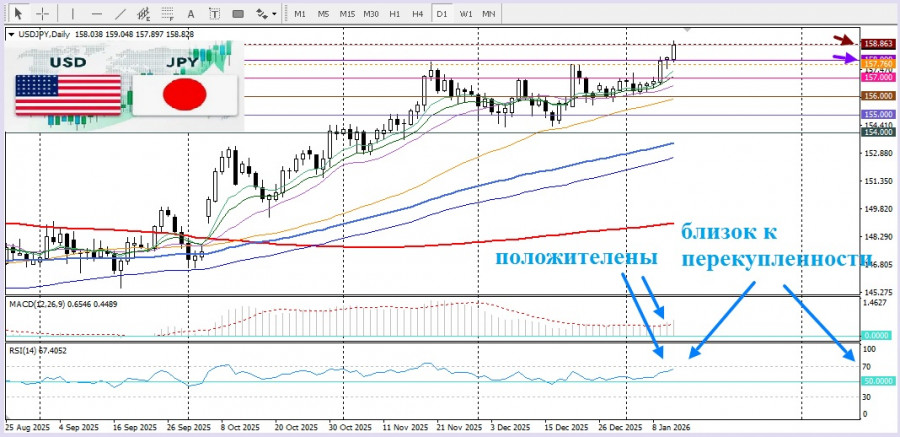 Сегодня японская йена очень ослабла, да не смотря на отсутствие глобального интереса к покупкам доллара США.Сообщения о том, что премьер-министр Японии Санаэ Такаичи может объявить досрочные парламентские выборы в первой половине февраля, усилили ожидания возможного расширения фискальных стимулов. Целью таких шагов может стать укрепление позиций правящей коалиции в парламенте и поддержание политической стабильности. Эти спекуляции усиливают давление на иену, поскольку рынки оценивают вероятность дополнительных мер поддержки экономики.