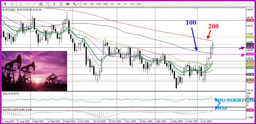 Сегодня американская нефть марки West Texas Intermediate (WTI) взлетела выше круглого уровня 61,00, почти добравшись до очень важной 200-дневной SMA.