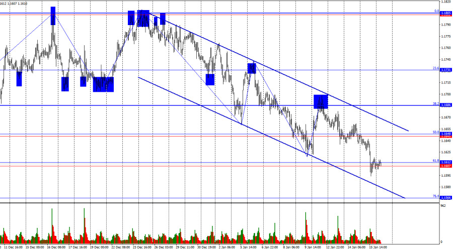 В течение последней отчетной недели профессиональные игроки открыли 3515 Long-контрактов и закрыли 1832 контракта Short. Настроение группы «Non-commercial» остается «бычьим» благодаря Дональду Трампу и его политике, и только усиливается с течением времени. Общее количество контрактов Long, сосредоточенных на руках спекулянтов, теперь составляет 298 тысяч, а контрактов Short – 135 тысяч. Это более, чем двукратное преимущество быков. Тридцать три недели подряд крупные игроки избавлялись от Short-позиций и наращивали Long. Затем начался «шатдаун», а сейчас мы видим ту же самую картину: профессиональные трейдеры продолжают наращивать Long-позиции. Политика Дональда Трампа остается наиболее весомым фактором для трейдеров, так как вызывает множество проблем, которые будут иметь долгосрочный и структурный характер для Америки. Например, ухудшение состояния рынка труда. Трейдеры опасаются потери независимости ФРС в 2026 году под давлением Трампа и на фоне ухода в отставку Джерома Пауэлла. Календарь новостей для США и Евросоюза: Евросоюз – Индекс потребительских цен (07-00 UTC). США – Изменение объемов промышленного производства (14-15 UTC). 16 января календарь экономических событий содержит в себе две записи, важных среди которых нет. Влияние информационного фона на настроение рынка в пятницу будет крайне слабым. Прогноз по EUR/USD и советы трейдерам: Продажи пары были возможны после отбоя от уровня 1,1686 на часовом графике с целями 1,1648 и 1,1612. Все цели достигнуты. Новые продажи возможный при закрытии под зоной 1,1607 – 1,1612 с целью 1,1566. Покупки станут возможными сегодня при отбое от зоны 1,1607 – 1,1612 на часовом графике с целью 1,1645 – 1,1648. Сетки уровней Фибоначчи построены по 1,1492 – 1,1805 на часовом графике и по 1,1066 – 1,1829 на 4-часовом.Материал предоставлен компанией InstaForex - www.instaforex.com