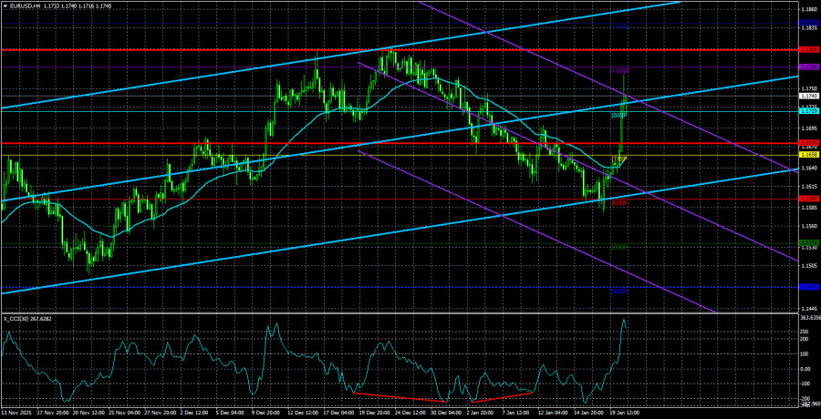 Валютная пара EUR/USD в течение вторника продолжала восходящее движение. Волатильность впервые за долгое время превысила 100 пунктов, что очень хороший сигнал. С сильным импульсом будет проще покинуть семимесячный боковой канал 1,1400-1,1830. Итак, европейская валюта растет второй день подряд. Как только Дональд Трамп ввел новые торговые пошлины против стран Европейского союза, не взирая на любые торговые соглашения и ранее достигнутые договоренности, доллар тут же начал падать. И у нас только один вопрос: неужели нужно было ждать новых пошлин, чтобы возобновить распродажи американской валюты? И еще один вопрос: неужели кто-либо в мире действительно считал, что новых торговых пошлин от Трампа не будет? Порой нам кажется, что мир позабыл тот факт, что Трамп уже был президентом США. 8 лет назад одиозный республиканец продемонстрировал всему миру, чего следует ждать. Как выяснилось, то были цветочки. Вторую каденцию Дональд Трамп начал с места в карьер, понимая, что 4 года президентского срока – это мало, а не много. Поэтому теперь дела не откладываются в долгий ящик, а период между угрозами и активными действиями минимален. В целом, сами трейдеры продолжают игнорировать большую часть поступающей информации. Напомним, что только в 2026 году у рынка было огромное количество причин продавать американский доллар. Статистика по рынку труда США провалилась в очередной раз, другие макроэкономические показатели тоже не блистали, Трамп начал год с военного вторжения в соседнее, суверенное государство, а в следующую неделю рассыпался в угрозах в адрес Дании и Евросоюза, Мексики, Колумбии и Кубы. ФРС трижды на последних заседаниях снизила ключевую ставку, против ее главы Джерома Пауэлла теперь ведется уголовное расследование, а сам Трамп, не увидев страстного желания Европы поделиться Гренландией, не моргнув глазом, ввел тарифы на 10%. А в Евросоюзе, тем временем, начался приступ паники. Складывается ощущение, что в Европе действуют по некому документу, в котором четко прописаны правила игры в международную политику. Тот факт, что Трамп будет атаковать любое государство на планете, чтобы получить от него деньги, территории, уступки и так далее – очевиден. Однако Брюссель демонстрирует полное непонимание происходящего. Европейские политики на этой неделе, как полагается, покачали головой и пришли к выводу, что Трамп допускает ошибку. Напомним, что в прошлом году даже холодильники в Европе считали, что Трамп ошибается и так поступать нельзя. В конце концов Урсула фон дер Ляйен заключила с Трампом соглашение, от которого у многих встали дыбом волосы. Вероятно, ЕС считал, что следует дать Трампу то, чего он хочет, и тогда претензий больше не будет... Трамп нанес еще один тарифный удар по ЕС, несмотря на ранее достигнутые договоренности. Трамп хочет без войны завладеть Гренландией. Евросоюз будет отвечать? Или начнет новые переговоры, чтобы утихомирить американского деспота? Средняя волатильность валютной пары EUR/USD за последние 5 торговых дней по состоянию на 21 января составляет 65 пунктов и характеризуется, как «средняя». Мы ожидаем движение пары между уровнями 1,1674 и 1,1804 в среду. Старший канал линейной регрессии направлен вверх, но по факту все еще продолжается флэт на дневном ТФ. Индикатор CCI последней сформировал еще одну «бычью» дивергенцию, которая вно