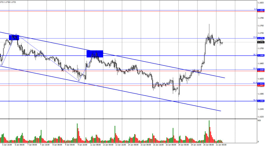 Пара EUR/USD во вторник продолжала процесс роста и достигла к концу дня уровень коррекции 23,6% – 1,1731. Отбой котировок от этого уровня сработает в пользу американского доллара и некоторого падения в направлении уровней Фибо 38,2% и 50,0%. Закрепление курса пары над уровнем 1,1731 повысит вероятность продолжения роста в направлении зоны сопротивления 1,1802–1,1805.Ситуация с волнами на часовом графике остается простой. Последняя завершенная волна вниз пробила лоу предыдущей волны, а новая волна вверх пробила предыдущий пик. Таким образом, тренд вновь поменялся на «бычий». Быки переходят в новое наступление, которого без Дональда Трампа могло бы и не случится. Однако Трамп продолжает накалять обстановку вокруг Гренландии, а рынки реагируют бегством от опасной американской валюты с неопределенными экономическими перспективами. Во вторник трейдеры продолжали отыгрывать события выходных и понедельника. Напомню, что Дональд Трамп объявил о введении новых торговых пошлин для некоторых стран Евросоюза, особо рьяно поддерживающих сохранение территориальной целостности Дании. Пошлины начнут действовать через 10 дней. Сегодня начинается международный экономический форум в Давосе, на котором Трамп проведет встречу с европейскими лидерами для обсуждения ситуации вокруг Гренландии. Однако практически все эксперты не ожидают деэскалации геополитического конфликта. Скорее, наоборот. Трамп, вероятно, продолжит настаивать на продаже Гренландии США и угрожать военным захватом острова или новыми торговыми тарифами. Европе не остается ничего иного, как отвечать той же монетой: тарифы, санкции, ограничения. Таким образом, уже в начале 2026 года торговая война между США и ЕС может не просто возобновиться, но и расшириться. Так как «виновником торжества» является Дональд Трамп, а новые пошлины ударят и по американской экономике тоже, рынок вполне справедливо возобновил продажи доллара. На мой взгляд, перспективы доллара на 2026 год из «туманных» превратились в «удручающие».