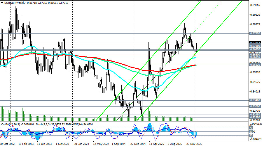 EUR/GBP в ходе вчерашнего ралли смогла укрепиться на 50 пунктов, поднявшись в зону сопротивлений между уровнями 0.8710 (ЕМА200 на 4-часовом графике) – 0.8717 (ЕМА50 на дневном графике). Сегодня пара продолжила рост, поднявшись к внутридневному максимуму 0.8738. EUR/GBP вступает в период, когда фундаментальные факторы благоприятствуют евро. В то время как Еврозона демонстрирует признаки стабилизации инфляции и экономической активности под управлением ЕЦБ, Великобритания сталкивается с явным охлаждением рынка труда и сохраняющимися ожиданиями дальнейшего цикла снижения ставок, отметили мы в нашем сегодняшнем фундаментальном анализе и обзоре «EUR/GBP: на фоне внутренних проблем британского фунта». Восходящее движение к уровням 0.8800 - 0.8900 выглядит реалистичным сценарием, если макроэкономическая дивергенция между Еврозоной и Великобританией сохранится. Пробой сегодняшнего максимума 0.8738 станет в этом случае сигналом для начала реализации данного сценария, а откаты будут рассматриваться как возможности для покупок. В случае резкого улучшения данных по розничным продажам Великобритании или неожиданно жёсткой риторики Банка Англии, а также при внезапном ослаблении евро возможна коррекция к зоне поддержки 0.8685 (ЕМА200 на 1-часовом графике) – 0.8680 (ЕМА144 на дневном графике), однако без признаков разворота тренда. Лишь пробой ключевого уровня поддержки 0.8650 (ЕМА200 на дневном графике) заставит «быков» по паре остановить покупки. Пробой же ключевого уровня поддержки 0.8582 (ЕМА200, ЕМА144 на недельном графике) и вовсе выедет EUR/GBP в зону долгосрочного медвежьего рынка, вернув приоритет коротким позициям. В основном же сценарии ожидаем дальнейший рост. Предпочтительными являются длинные позиции. *) см. также: