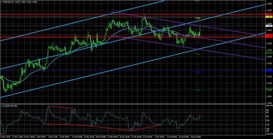 Валютная пара GBP/USD не желает следовать на этой неделе за парой EUR/USD, хоть это и было бы максимально логично. Напомним, что большую часть времени евро и фунт торгуются практически одинаково, а фундаментальный фон на этой неделе на 90% касается доллара США. Таким образом, именно доллар растет или падает, а остальные валюты просто ходят за ним. Но только не фунт и только не на этой неделе. Чем объяснить подобное поведение британского смутьяна? На самом деле, ничем. В очередной раз напоминаем трейдерам, что рынок движется не только на основании фундамента или макроэкономики. Если бы логическая цепочка «новость – движение» работала, то любое движение на рынке можно было бы спрогнозировать с вероятностью 100%. В том то и дело, что на практике все гораздо сложнее. Рынок – это огромное количество участников, далеко не каждый из которых преследует цель получения прибыли на курсовой разнице. Таким образом, британская валюта, возможно, и росла бы, но какой-нибудь крупный игрок начал резко продавать британский фунт и предложение стало выше. Поэтому еще раз напомним – не следует пытаться объяснить абсолютно любое движение на рынке или отсутствие оного. В последние дни и недели фунт стерлингов, во-первых, торгуется в ограниченном диапазоне, во-вторых, постоянно прыгает то вверх, то вниз. То есть рынок нервничает и паникует. С чем связана паника? Да все с тем же, что и раньше. Гренландия, нападки Трампа на ФРС, очередная критика и угрозы в адрес Пауэлла, раздача угроз в адрес стран Латинской Америки, непонятная сделка с Марком Рютте, введение новых тарифов, через четыре дня отмена новых тарифов. А, по сути, пара GBP/USD уже несколько недель подряд стоит на одном месте. Что может ее сдвинуть с этого места? На наш взгляд, это явно не отчет по ВВП США. Еще первые две оценки показали достаточно сильный рост американской экономики в третьем квартале, которому никто на рынках уже просто не верит. Напомним, что структура прошлой оценки показала – ВВП растет на повышении государственных расходов(за что, кстати, Трамп «проехался» по Евросоюзу), а также за счет поступления импортных пошлин(которые никак не может отменить Верховный суд США). На наш взгляд, техника – это единственное, от чего сейчас следует отталкиваться при принятии торговых решений. Техника на дневном ТФ говорит о весьма вероятном возобновлении восходящего тренда, а паузы в движении – это абсолютно нормальное явление. Техника на 4-часовом ТФ говорит о сложной коррекции, после завершения которой опять-таки должен возобновиться тренд. Индикатор CCI уже устал заходить в область перепроданности и рисовать «бычьи» дивергенции. И давайте вспомним, что по евровалюте уже 7 месяцев(!!!) наблюдается тотальный флэт. А фунт стерлингов зависим от евровалюты. Спираль продолжает сжиматься, но когда-нибудь она «выстрелит». Средняя волатильность пары GBP/USD за последние 5 торговых дней составляет 77 пунктов. Для пары фунт/доллар это значение является «средним». В пятницу, 23 января, таким образом, мы ожидаем движения внутри диапазона, ограниченного уровнями 1,3414 и 1,3568. Старший канал линейной регрессии направлен вверх, что указывает на восстановление тренда. Индикатор CCI шесть раз заходил в область перепроданности за последние месяцы и сформировал множество «бычьих» дивергенций, что постоянно предупреждает трейдеров о п