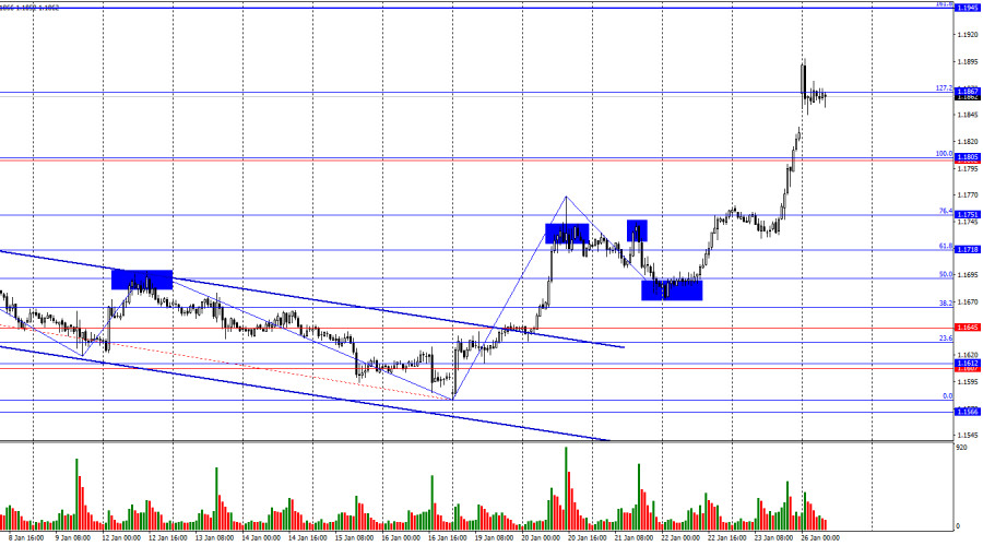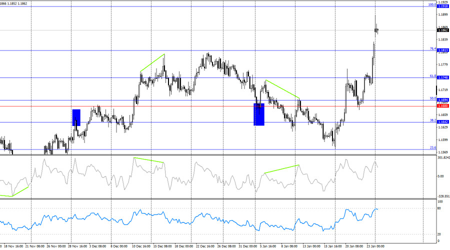 Ситуация с волнами на часовом графике остается простой. Последняя завершенная волна вниз не пробила лоу предыдущей волны, а последняя волна вверх пробила предыдущий пик. Таким образом, тренд остается «бычьим». Быки перешли в новое наступление, которого без Дональда Трампа могло бы и не случится. Трамп накалил обстановку вокруг Гренландии до предела, а рынки отреагировали бегством от опасной американской трейдеры с неопределенными экономическими перспективами.