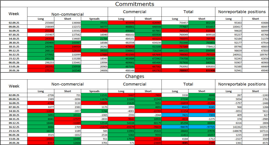 Тридцать три недели подряд крупные игроки избавлялись от Short-позиций и наращивали Long. Затем начался «шатдаун», а сейчас мы видим ту же самую картину: профессиональные трейдеры продолжают наращивать Long-позиции. Политика Дональда Трампа остается наиболее весомым фактором для трейдеров, так как вызывает множество проблем, которые будут иметь долгосрочный и структурный характер для Америки. Например, ухудшение состояния рынка труда. Трейдеры опасаются потери независимости ФРС в 2026 году и геополитических амбиций Дональда Трампа.