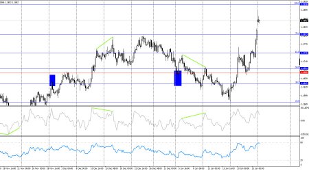 На 4-часовом графике пара продолжает процесс роста и выполнила закрытие над уровнем Фибо 76,4% – 1,1813. Таким образом, процесс роста может быть продолжен в направлении следующего уровня Фибо 100,0% – 1,1918. Закрепление котировок под уровнем 1,1813 сработает в пользу доллара США и некоторого падения в направлении коррекционного уровня 61,8% – 1,1748. Назревающих дивергенций сегодня не наблюдается ни у одного индикатора.
