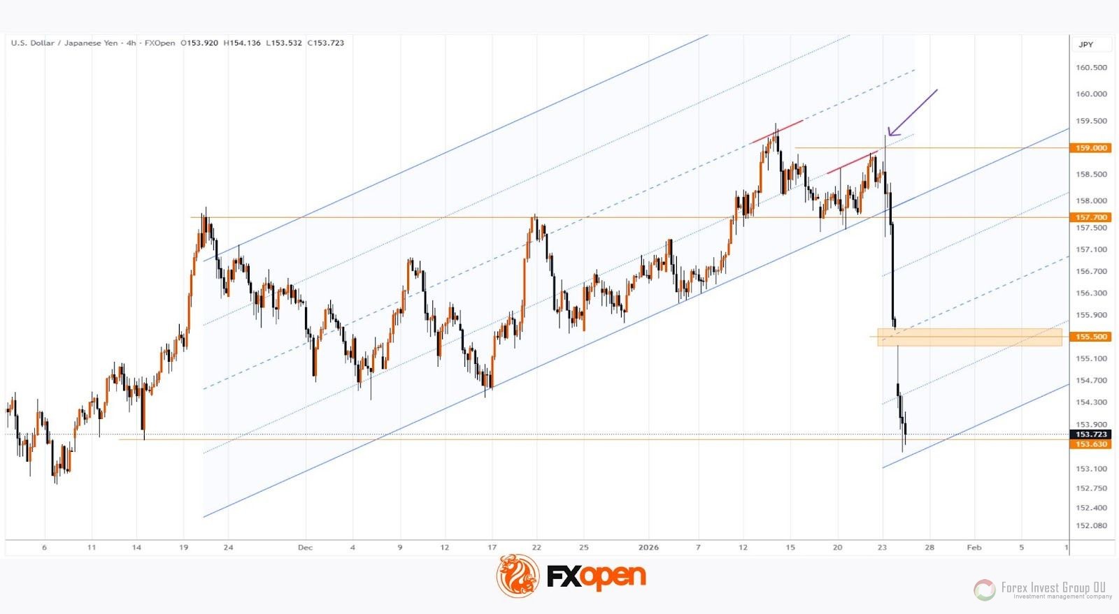 FxSignal 26-01-2026, 15:00 102 Аналитика, прогнозы валютного рынкаКак свидетельствует график USD/JPY, курс резко упал, достигнув минимума с начала ноября 2025 года.