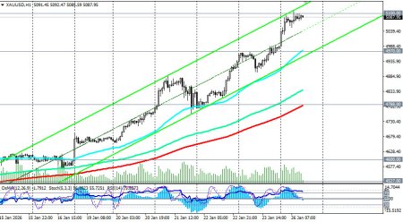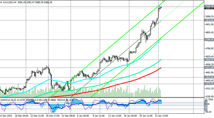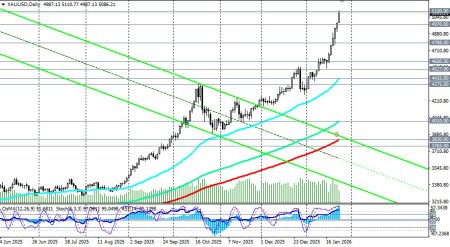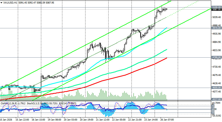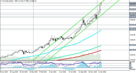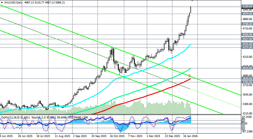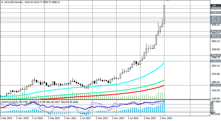 В нашем предыдущем обзоре XAU/USD: сценарии динамики на 13.01.2026 мы отмечали, что «в основном сценарии, по-прежнему, ждём возобновления роста. Сигналом для новых покупок может стать пробой внутридневного максимума 4607.00, а затем предыдущего и рекордного 4630.00». Как видим, события развиваются по этому основному сценарию (Buy «по-рынку», Buy Stop 4608.00, 4630.00), а цели 4700.00, 4800.00, 4900.00, 5000.00 достигнуты менее, чем за 2 недели. Фундаментальный фон и внешний шоковый риск создают прочную поддержку для золота: рекордные уровни отражают сочетание геополитики, фискальной неопределённости, центробанковского спроса и вопросов по независимости ФРС – также отмечали мы в предыдущем фундаментальном анализе и обзоре «XAU/USD: прочная поддержка для золота». По сути, мало что изменилось, а «ключевым фактором роста остаётся сочетание геополитической неопределённости, слабости доллара США и ожиданий смягчения монетарной политики ФРС» (см. наш сегодняшний фундаментальный анализ и обзор «XAU/USD: рекордные максимумы и рост 6-й день подряд»). Непрерывный рост котировок поддерживается основными ключевыми драйверами - мощным спросом на безопасные активы, масштабной стратегией «Продай Америку» (Sell America), структурными изменениями в спросе и ожиданиями смягчения ФРС. В основном сценарии ждём продления роста котировок. Сигналом для новых покупок может стать пробой сегодняшнего максимума 5110.00. Ближайшая цель - преодоление и закрепление выше отметки 5100.00 («круглый» уровень и верхняя граница восходящего канала на недельном графике). При сохранении текущей динамики следующими целями могут стать 5200.00 – 5250.00. Далее цена может двигаться пока не «нащупает» новые локальные уровни сопротивления. При этом откат к уровням поддержки 5000.00, 4970.00 (ЕМА200 на 15-минутном графике), 4900.00, 4800.00, 4788.00 (ЕМА200 на 1-часовом графике) предоставляет дополнительные возможности для входа в длинные позиции по более выгодным ценам. Технические индикаторы (в нашем случае это – RSI, OsMA, Стохастик) на дневном, недельном и месячном графиках также остаются на стороне покупателей, сигнализируя о сохранении потенциала для дальнейшего роста цены, а длительная позиция «перекупленности» в данной ситуации говорит о сохраняющемся сильном бычьем импульсе. В альтернативном сценарии цена перейдет в фазу коррекционного снижения. Самым ранним сигналом может стать пробой краткосрочного уровня поддержки 5056.00 (ЕМА200 на 5-минутном графике), а затем сегодняшнего минимума 4988.00 и отметки 4970.00, через которую проходит ЕМА200 на 15-минутном графике. Цель коррекции – зона 4800.00 (ЕМА50 и нижняя линия восходящего канала на 4-часовом графике) – 4788.00 (ЕМА200 на 1-часовом графике), от которой можно строить новые ордера на покупку. При более негативном сценарии цена пробьёт уровень поддержки 4788.00 и углубится в зону краткосрочного медвежьего рынка, направившись в сторону важных уровней поддержки 4600.00, 4527.00 (ЕМА200 на 4-часовом графике), 4435.00 (ЕМА50 на дневном графике), вблизи которых, учитывая общий восходящий тренд цены, можно выставить новые отложенные ордера на покупку, рассчитывая на отбой и возобновление роста. Актуальными в долгосрочном периоде остаются длинные позиции. Лишь пробой зоны поддержки 4435.00 – 4375.00 (локальные максимумы) и дальнейшее снижение могут всерьёз насторожить покупателей. открыть торговый счет + зарегистрироваться в системе копирования