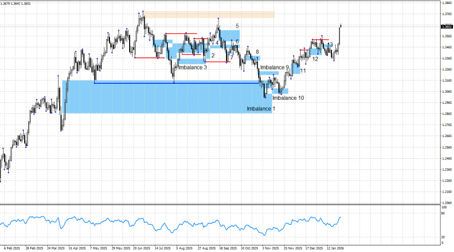 Началась новая неделя с новых атак от Дональда Трампа. На этот раз под прицелом оказалась Канада, которая позволяет себе без разрешения Вашингтона торговать с Китаем. Трейдеры пока никак не отреагировали на новость о возможном повышении пошлин для Канады на 100%, но не следует посыпать голову пеплом заранее. В данное время все складывается в пользу британца. ФРС на этой неделе вряд ли окажет поддержку доллару, Дональд Трамп продолжает атаковать, критиковать и угрожать каждому государства мира по очереди, а с 1 февраля в Америке может начаться новый «шатдаун». Напомню, что в прошлый раз работа правительства была приостановлена на полтора месяца, а разрешить проблему удалось лишь принятием временного финансирования до 31 января. Таким образом, если финансирование не будет продлено в ближайшее время, с 1 февраля во всех кинотеатрах страны смотрите новый блокбастер под названием «Шатдаун или искусство дипломатии». Так как «бычий» тренд по евро сохраняется, на мой взгляд, сохраняется «бычий» тренд и по британцу. Я не могу себе представить «бычий» тренд по евровалюте и одновременно «медвежий» тренд по фунту. Однако рабочих «бычьих» паттернов в данное время нет. Сегодня может быть образован новый «бычий» имбаланс, который уже завтра может позволить трейдерам открывать сделки на покупку. В понедельник экономических данных было очень немного, а трейдеры совершенно спокойно отнеслись к позитивному отчету по заказам на товары длительного использования в США. Объемы заказов выросли на 5,3% в ноябре, что значительно выше ожиданий трейдеров. Но, как и на прошлой неделе, позитивный американский отчет был проигнорирован, так как рынок всецело увлечен геополитикой, массовыми беспорядками в США, а также новыми проявлениями торговой войны Трампа. В США общий информационный фон остается таковым, что ничего, кроме падения американца, в долгосрочном плане ожидать нельзя. Ситуация в США остается достаточно сложной. «Шатдаун» длился полтора месяца, демократы и республиканцы договорились о финансировании лишь до конца января, который заканчивается через неделю. Статистика по рынку труда США продолжает разочаровывать или игнорироваться. Последние три заседания FOMC завершились принятием «голубиного» решения, а последние данные позволяют предположить, что пауза в смягчении ДКП будет недолгой. Военная агрессия Трампа, угрозы в адрес Дании, Мексики, Кубы и Колумбии, возбуждение уголовного дела против Джерома Пауэлла прекрасно дополняют текущую картину «американского политического кризиса». На мой взгляд, у быков есть все, чтобы продолжить наступление и выполнить возврат к пикам прошлого года. Для «медвежьего» тренда нужен сильный и стабильный для американца позитивный информационный фон, которого при Дональде Трампе сложно ожидать. Да и самому президенту США не нужен дорогой доллар, так как торговый баланс в этом случае останется дефицитным. Поэтому в «медвежий» тренд по британцу я по-прежнему не верю, несмотря на довольно сильное падение в сентябре и октябре. Слишком много факторов риска остается висеть мертвым грузом на долларе. За счет чего медведи собираются двигать фунт дальше вниз, если в данное время формируется все-таки «медвежий» тренд? При появлении новых «медвежьих» паттернов можно будет вновь рассмотреть потенциальное падение 