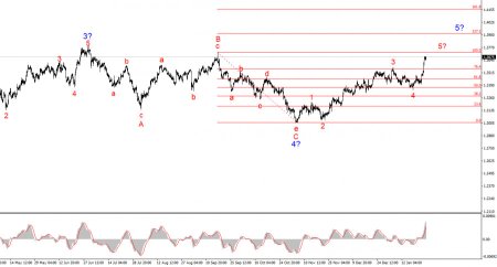 Волновая картина инструмента GBP/USD приобрела более понятный вид. В данное время продолжается построение предполагаемой волны 5 в 5, но внутренняя волновая структура глобальной волны 5 может принять гораздо более протяженный вид. Я считаю, что повышение котировок в ближайшее время будет продолжено с целями, находящимися около отметок 1,3721 и 1,3913, что соответствует 100,0% и 127,2% по Фибоначчи. После завершения текущего пятиволнового набора инструмент может построить три коррекционные волны. Но на данный момент повышательный участок еще не завершен, а после коррекции я жду новый импульсный участок тренда в направлении 42-й фигуры.Основные принципы моего анализа: