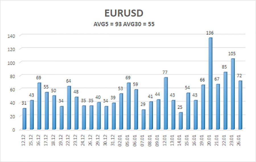 Валютная пара EUR/USD в течение понедельника торговалась в спокойном режиме и преимущественно вбок. Однако мы не сомневаемся – это лишь пауза перед очередным штормом. И новый шторм доллару США явно не понравится. Не успели страсти вокруг Гренландии немного улечься, как Дональд Трамп начал новую эпопею под названием «США против Канады». Складывается впечатление, что Трамп имеет претензии ко всем государствам на планете Земля, все они живут неправильно и существуют только благодаря Америке. На этот раз одиозному президенту США не понравилась возможная торговая сделка между Китаем и Канадой. По мнению Трампа, Канада хочет стать «буфером» между Китаем и США, принимая товары из Поднебесной для их дальнейшего траффика в Америку. Таким образом, мы вновь видим, как Трамп пытается установить мировой порядок, который будет выгоден ему. При чем сейчас речь идет уже не только о взаимоотношениях между Америкой и другими государствами. Теперь даже Уганда может получить пошлины от США за то, что торгует с Зимбабве. Все будет зависеть от мнения Трампа по этому поводу и его настроения. Похоже, что Трамп хочет, чтобы любая страна прежде, чем делать какой-либо шаг на международной арене, спрашивала разрешения у Вашингтона. Звучит, как абсурд, но именно этого, судя по действиям, добивается американский президент. Трамп, в частности, уже успел заявить, что Канада живет только благодаря США, а в Канаде ее премьер-министр Марк Карни призвал мир бороться с автократией. Президент-республиканец обиделся и не пригласил Канаду в «Совет мира», председателем которого пожизненно должен быть сам Трамп. Если бы мы не были уверены в том, что все происходящее – реальность, подумали бы, что это какой-то фантастический роман. Следует также отметить, что Трамп посягает на суверенитет и независимость Канады с того дня, как во второй раз стал президентом США. Первые нападки Трампа заключались в том, что Канаде было предложено стать 51-м штатом Америки. Сейчас Трамп хочет ввести 100%-ые пошлины на товары из Канады, если та достигнет соглашения о свободной торговле с Китаем. В общем, на самом деле мы абсолютно ничему не удивлены. Весь прошлый год мы постоянно говорили, что Трамп главным своим врагом считает Китай. Поэтому против Китая постоянно выдвигаются претензии. Поэтому с Китаем нельзя торговать другим странам. Помимо этого, Трамп пытается взять себе то, что плохо лежит. Например, Гренландию или венесуэльскую нефть. Главное обставить все так, чтобы у всего мира не возникло серьезных претензий к Вашингтону. И план Трампа работает пока, если не на 100%, то процентов на 80 точно. Практически все страны мира, кроме Канады, России, Ирана и Китая, предпочитают не портить отношения с одиозным республиканцем. И, как следствие, в той или иной степени уступают под давлением его угроз. А Трамп, понимая, что его тактика отлично работает, выдвигает все новые и новые требования поделиться ресурсами, поделиться деньгами, поделиться территориями. Это бесконечная игра. Средняя волатильность валютной пары EUR/USD за последние 5 торговых дней по состоянию на 27 января составляет 93 пункта и характеризуется, как «средняя». Мы ожидаем движение пары между уровнями 1,1794 и 1,1980 во вторник. Старший канал линейной регрессии направлен вверх, что указывает на дальнейший рост евровалюты. Индикатор CCI заходил в 