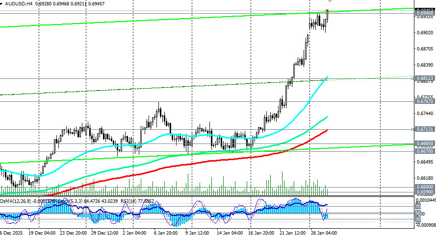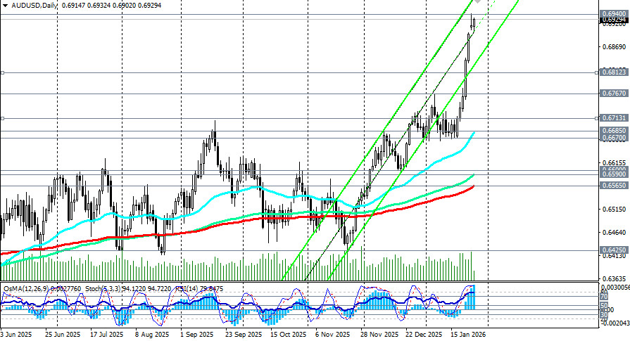 Пока готовилась данная статья, цена пробила вчерашний максимум на уровне 0.6940 и достигла нового рекорда с сентября 2024 года вблизи 0.6950. AUD/USD демонстрирует сильный восходящий импульс, поддерживаемый сочетанием слабого доллара США и ожиданий ужесточения политики РБА. Фундаментальный фон благоприятствует дальнейшему укреплению австралийского доллара: сильная внутренняя экономика требует сдерживания инфляции, в то время как доллар США страдает от политических потрясений, отметили мы в нашем сегодняшнем фундаментальном анализе и обзоре «AUD/USD: бычий импульс на фоне ослабления доллара и ожиданий ужесточения политики РБА». Ключевые уровни Сопротивление: 0.6940 – 0.6980 (верхняя граница восходящего канала на дневном графике). Его пробой откроет путь к 0.7100 – 0.7190 (ЕМА144 на месячном графике). Поддержка: 0.6860 (нижняя граница восходящего канала) – 0.6812 (ЕМА200 на 1-часовом графике). Более отдаленная и среднесрочная – 0.6685 (EMA 50 на дневном графике). Основной сценарий При сохранении слабости доллара США и подтверждении устойчиво высокой инфляции в Австралии пара AUD/USD может продолжить рост в направлении 0.7000 – 0.7100, сохранять бычий уклон при коррекциях к поддержке. Дальнейший рост и пробой стратегических уровней сопротивления 0.7190, 0.7300, 0.7320 (ЕМА200 на месячном графике) выведет цену в зону глобального бычьего рынка, открыв цене дорогу в сторону локальных уровней сопротивления 0.7900, 0.8000 (максимумы 2021 года), 0.8100 (максимумы 2018 года). Первым сигналом для начала реализации данного сценария может стать пробой отметки 0.6950, а затем 0.6980. Однако, стоит обратить внимание на предупреждающий сигнал: RSI на дневном и недельном графиках находится в зоне перекупленности (около 80), что указывает на растянутость текущего ралли и высокую вероятность технической коррекции или консолидации перед новым рывком. Поэтому, если данные по CPI окажутся слабее ожиданий, ФРС сохранит жёсткую риторику, усилится спрос на доллар как защитный актив, пара может перейти в фазу коррекции с целями 0.6850 – 0.6800. Более глубокая коррекция подразумевает снижение к зоне поддержки вокруг уровней 0.6713 (ЕМА200 на 4-часовом графике), 0.6685 (EMA 50 на дневном графике). Пробой ключевой поддержки на уровне 0.6670 (ЕМА200 на недельном графике) вернет цену в зону долгосрочного медвежьего рынка с целями снижения на ключевых уровнях поддержки 0.6590 (ЕМА144 на дневном графике), 0.6565 (ЕМА200 на дневном графике). Их пробой, в свою очередь, окончательно переломит среднесрочный бычий тренд, вернув AUD/USD также и в зону долгосрочного медвежьего рынка. Самым ранним сигналом для реализации данного альтернативного сценария может стать пробой сегодняшнего минимума и ЕМА200 на 15-минутном графике 0.6902. Уровни поддержки: 0.6902, 0.6900, 0.6812, 0.6800, 0.6767, 0.6713, 0.6700, 0.6685, 0.6670, 0.6600, 0.6590, 0.6565, 0.6500 Уровни сопротивления: 0.6940, 0.6950, 0.6980, 0.7000, 0.7100, 0.7190, 0.7200, 0.7300, 0.7320, 0.7890, 0.7900, 0.8000, 0.8100 Торговые сценарии