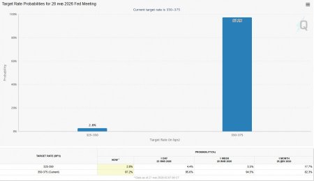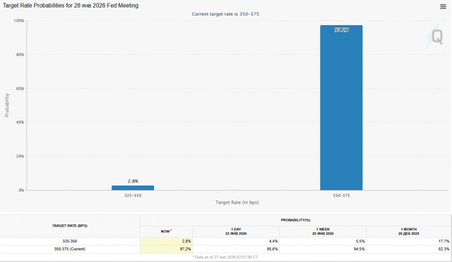 *) см. также: Торговые индикаторы InstaForex по EUR/USD[i][/i] Как сообщили сегодня в ADP, рост занятости в частном секторе в январе составил +7750, что ниже скромного роста в +8000 в предыдущем 4-недельном периоде, сигнализируя о продолжающейся утрате импульса найма. Опубликованные чуть позже (в 14:00 GMT) данные по динамике цен на рынке жилья США не оказали существенного влияния на доллар, который продолжил снижаться после публикации отчёта ADP. Теперь участники рынка будут ждать публикации индекса деловой активности в производственном секторе ФРБ Ричмонда и индекса доверия потребителей Conference Board (в 15:00 GMT), которые станут последними более-менее важными макро данными перед 2-дневным заседанием ФРС, начинающимся сегодня. Участники рынка исключают изменения процентных ставок на предстоящих заседаниях. Согласно данным CME FedWatch Tool, вероятность сохранения ставки ФРС в диапазоне 3,50–3,75% оценивается в 97%. Инвесторы будут внимательно следить не столько за самим решением, сколько за риторикой и тоном сопутствующих заявлений и пресс-конференции ФРС, в ходе которой глава американского ЦБ Пауэлл ответит на вопросы и обрисует перспективы монетарной политики. Жёсткие сигналы со стороны ФРС и акцент на инфляционных рисках поддержат американский доллар. Намёки же на замедление экономики или более ранний переход к снижению ставок усилят давление на USD. Дополнительную неопределённость создают политические факторы — обсуждение смены главы ФРС и риски частичного шатдауна правительства США. А пока что доллар остается под давлением, в то время как его индекс USDX продолжает снижаться, пробив стратегический уровень поддержки 96.80 (ЕМА200 на месячном графике) и двигаясь в сторону минимумов с марта 2022 года, достигнутых вблизи отметки 96.20. Между тем, пара EUR/USD уверенно сохраняет восходящий тренд и торгуется вблизи долгосрочных максимумов выше 1.1900 – 1.1915, обновляя уровни, не виденные с июля 2021 года. Евро укрепляется на фоне системной слабости доллара США, вызванной политическими рисками, торговыми разногласиями и ожиданиями смягчения монетарной политики Федеральной резервной системы, и рынок воспринимает текущую динамику как устойчиво бычью, при этом попытки коррекции пока остаются ограниченными. Основным фактором роста пары остаётся ослабление доллара США, обусловленное сразу несколькими причинами: обострением торговых конфликтов США с ключевыми партнёрами, включая Южную Корею, ростом рисков частичного шатдауна правительства США на фоне противостояния в Конгрессе, усилением политического давления на ФРС и неопределённостью вокруг будущего руководства регулятора, ожиданием продолжительного периода паузы или дальнейшего смягчения политики ФРС. Несмотря на отдельные сильные макроэкономические данные, такие как рост заказов на товары длительного пользования, доллар не получает устойчивой поддержки, что усиливает спрос на евро. Со стороны Еврозоны фундаментальный фон остаётся относительно устойчивым: инфляция постепенно замедляется, но остаётся выше целевого уровня ЕЦБ. Сам же Европейский центральный банк сохраняет осторожную и взвешенную позицию, а ожидания резкого смягчения его политики отсутствуют. Выступления главы ЕЦБ Кристин Лагард (ближайшее - сегодня в 17:00 GMT) и представителей Бундесбанка рассматриваются рынком как потенциальный источник сигналов,