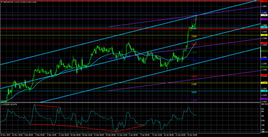 Валютная пара GBP/USD во вторник также продолжала восходящее движение, хотя локальных оснований для этого не было никаких. Календарь Великобритании пуст, в Штатах был опубликован один лишь недельный отчет ADP. Тем временем, рынок переключил свое внимание с Гренландии на Канаду. Против Канады Дональд Трамп пообещал ввести пошлины на 100% за то, что... а за что, собственно? Президент США обвинил Оттаву в том, что она хочет стать «транзитным хабом» для китайских товаров в США. Трампу не нравится, что Канада стремится достичь некоторых торговых соглашений с Китаем, чтобы упростить процесс торговли между двумя странами. Поэтому лидер США заговорил о якобы соглашении о свободной торговле, которого, по словам Марка Карни, премьер-министра Канады, нет и не планируется. В очередной раз мы слышим из уст американского президента заявления, которые полностью расходятся с реальным положением вещей. В очередной раз рынок должен гадать, что стало истинной причиной нового акта агрессии Трампа к своему соседу? На наш взгляд, все эти вопросы крайне простые и ответы на них можно дать, не особенно напрягаясь. Дональд Трамп хочет, чтобы весь мир жил так, как считает правильным он. Если вы хотите торговать с кем-то, должны спросить разрешения у Трампа. Если режим соседней страны Трампа не устраивает, значит готовьтесь к военному перевороту. Если китайская экономика растет, у Трампа начинается нервный тик, потому что примерно 50% его действий направлены на подавление экономической активности Китая. Параллельно с этим Трамп любит деньги и стремится со всех стран-партнеров получить по максимуму. Действительно, почему бы не получить дополнительные деньги в бюджет, если, например, Евросоюз готов платить эти деньги, не особенно сильно препираясь? Другие страны мира также готовы дать Трампу то, чем он хочет, лишь бы им не перекрывали доступ на американский рынок, с которого они и кормятся. Ну и, конечно же, НАТО. Трамп начал свою вторую каденцию с угроз покинуть НАТО, а страны Европы отлично понимают, что сами они останутся беззащитными в этом случае. На построение нового военного альянса уйдут годы и десятки миллиардов евро. Поэтому гораздо проще и дешевле договориться с Трампом сейчас, чем потом создавать новые альянсы и самим думать, как себя защитить. Президент США просто умело разыгрывает те козыри, которые есть у него на руках: богатый американский рынок и НАТО. Поэтому от Канады Трамп хочет ни чего-то конкретного. Он хочет все и сразу: чтобы Канада стала 51-м штатом США, чтобы Канада не торговала с Китаем, чтобы Канада платила пошлины, чтобы Канада поклонялась США и лично Трампу. Вот и все объяснение. Средняя волатильность пары GBP/USD за последние 5 торговых дней составляет 105 пунктов. Для пары фунт/доллар это значение является «средним». В среду, 28 января, таким образом, мы ожидаем движения внутри диапазона, ограниченного уровнями 1,3660 и 1,3870. Старший канал линейной регрессии направлен вверх, что указывает на восстановление тренда. Индикатор CCI шесть раз заходил в область перепроданности за последние месяцы и сформировал огромное количество «бычьих» дивергенций, что постоянно предупреждало трейдеров о грядущем возобновлении восходящего тренда. Ближайшие уровни поддержки: S1 – 1,3733 S2 – 1,3672 S3 – 1,3611 Ближайшие уровни сопротивления: R1 – 1,3794