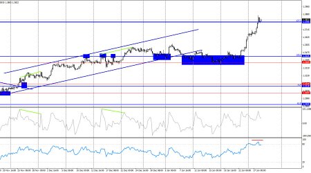 На часовом графике пара GBP/USD во вторник продолжала процесс роста и к концу дня оказалась около уровня 1,3845. Отбой пары от этого уровня сработал в пользу доллара США и некоторого падения в направлении уровня Фибо 161,8% – 1,3755. Отбой котировок от уровня 1,3755 позволит трейдерам ожидать возобновление роста британца в направлении уровней 1,3845 и 1,3931. Закрепление котировок под уровнем 1,3755 повысит шансы на падение в направлении зоны поддержки 1,3611–1,3620.