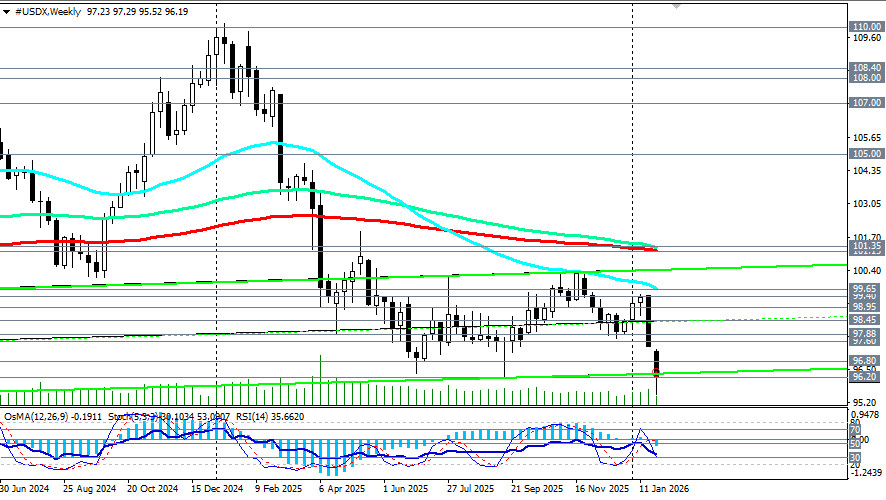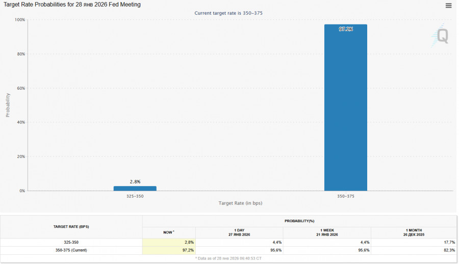 Ожидания смягчения политики ФРС. Рынки уверены (97% вероятность по данным CME FedWatch), что ставка останется в диапазоне 3,50%-3,75%, но уже закладывают снижение в марте (15% вероятность) и два последующих снижения в 2026 году. Такие ожидания лишают доллар поддержки со стороны ФРС.