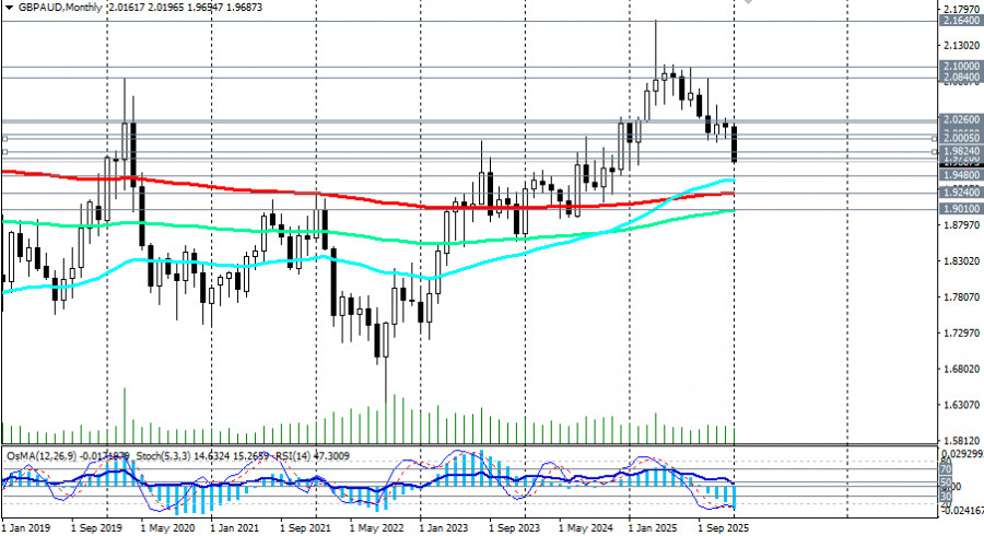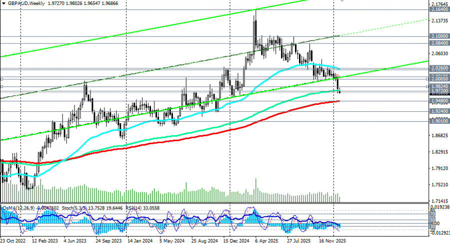 В совокупности эти факторы формируют более благоприятный фундаментальный фон для австралийского доллара в средне- и краткосрочной перспективе в сравнении с фунтом. Баланс рисков в ближайшие недели и месяцы смещен в пользу австралийского доллара. Ключевыми факторами, определяющими динамику GBP/AUD, станут: 1.Заседание РБА (2-3 февраля). Если центральный банк Австралии действительно повысит ставку или даст крайне «ястребиные» сигналы, это станет мощным катализатором для укрепления AUD и, соответственно, падения пары GBP/AUD. 2.Данные по инфляции и рынку труда в Великобритании. Любые признаки устойчивого снижения инфляции и дальнейшего охлаждения рынка труда будут усиливать ожидания смягчения политики BoE, оказывая давление на фунт. 3.Глобальный аппетит к риску. Улучшение глобальных настроений (например, на фоне разрядки в торговых конфликтах) традиционно поддерживает «рисковые» валюты, такие как AUD, за счет GBP. 4.Динамика цен на сырье. Продолжающийся рост цен на ключевые товары австралийского экспорта будет служить дополнительным фундаментальным доводом в пользу силы AUD. Техническая картина С технической точки зрения, GBP/AUD торгуется в зоне краткосрочного и среднесрочного медвежьего рынка, оставаясь, при этом, в зоне долгосрочного бычьего рынка – выше ключевой зоны поддержки 1.9500 – 1.9480 (ЕМА200 на недельном графике) – и в зоне глобального бычьего рынка – выше ключевой зоны поддержки 1.9300 – 1.9240 (ЕМА200 на месячном графике). Ключевые уровни Поддержка: