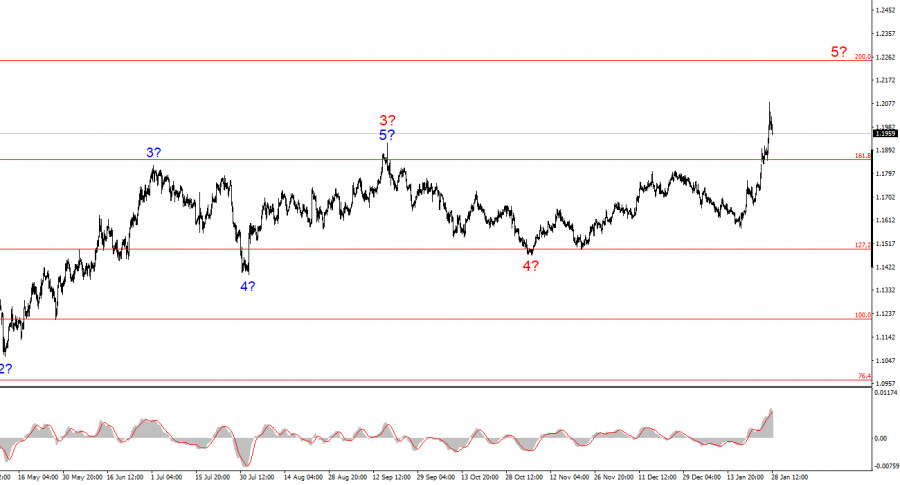 Курс инструмента EUR/USD в течение среды снизился на 90 базовых пунктов, во вторник – прибавил 160, сегодня вечером – заседание ФРС, а Трамп готовится атаковать Иран. Такова краткая сводка новостей за последние сутки. Чтобы подробно разобраться во всех новостях, потребуется, вероятно, пять обзоров. Но попробуем уложиться в один. Начался очередной обвал американской валюты с повышения тарифов против Канады и Южной Кореи. Затем Дональд Трамп сообщил, что текущий курс доллара(который находится на четырехлетних минимумах) является «блестящим» для американской экономики. Сегодня Трамп написал в соцсети Truth Social о приближении авианосной группы к берегам Ирана и призвал Тегеран как можно быстрее сесть за стол переговоров и заключить сделку о безъядерном статусе страны. И, как я уже сказал, вечером – заседание ФРС, президент которого находится под уголовным расследованием, инициированным тоже Трампом. Кстати, один из членов комитета FOMC также находится в состоянии судебного расследования. Речь идет о Лизе Кук. Благоприятным для американской валюты текущий новостной фон назвать никак не получается. Дональд Трамп сообщил, что флот, который в данное время направляется в иранский регион, значительно превышает по мощности силы, которые ранее применялись при атаке на Венесуэлу. Рискну предположить, что эта группа авианосцев направляется к Ирану не просто для того, чтобы постоять около его берегов. Если состоится авиаудар, для доллара это может быть даже позитивная весть. Напомню, что прошлым летом, когда был нанесен удар по ядерным объектам Ирана, спрос на американскую валюту вырос ненадолго. Помимо этого, текущая волновая разметка предполагает построение коррекционной волны. Следовательно, рынок на некоторое время может взять паузу в продажах американской валюты. «Голубиных» решений от ФРС в ближайшее время не ожидается, поэтому продавцы могут поправить свое положение.Общие выводы.