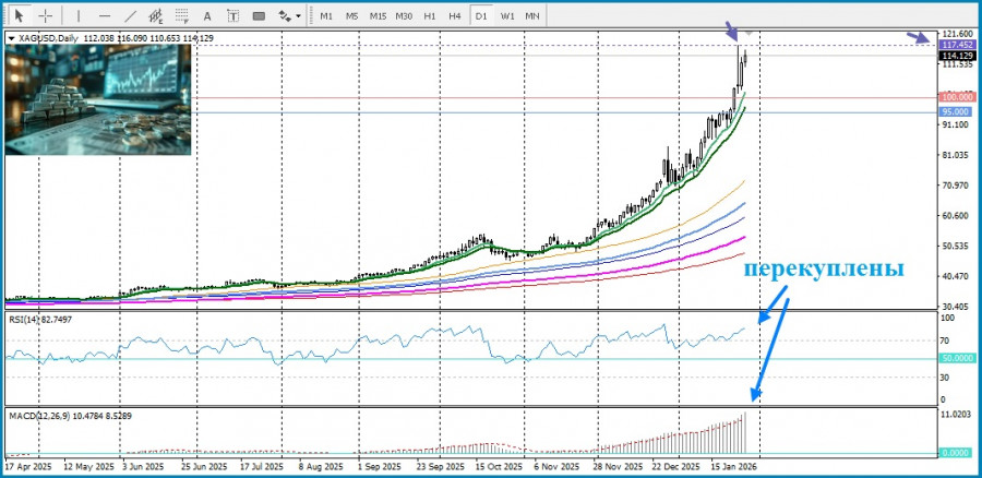 Сегодня серебро снова установило новый исторический максимум в районе $95,89. Белый металл