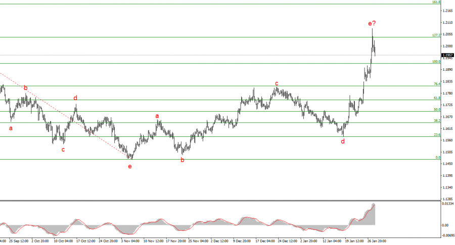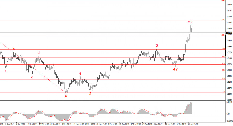 Уже буквально через час станут известны итоги первого заседания ФРС в текущем году. Начну не с разбора самого заседания, а с волновой разметки. В данное время практически все участники рынка ожидают дальнейшего снижения американской валюты. Новостной фон продолжает оказывать огромное давление на доллар, но хочу напомнить, что при любом новостном фоне инструмент не может двигаться со скоростью света только в одну сторону. На мой взгляд, сегодня и в ближайшие несколько дней мы увидим укрепление американской валюты. Волновая разметка последнего повышательного участка приняла достаточно убедительный вид. Безусловно, восходящий участок тренда может принять и более протяженный вид(и, вероятнее всего, так и будет), но пауза тоже необходима. Федеральная Резервная система, которая уже в ближайшее время может узнать имя нового председателя, будет проводить встречу при весьма сложных обстоятельствах. Против Джерома Пауэлла ведется уголовное расследование, сам Пауэлл впервые за 8 лет открыто заявил о политических гонениях со стороны администрации президента из-за нежелания смягчать политику так, как того хочет президент. На мой взгляд, на основании одного только этого факта ожидать нового раунда снижения процентной ставки не стоит ни сегодня, ни в ближайшие месяцы. Согласно инструменту CME FedWatch, вероятность снижения ставки в январе оценивается фьючерсными рынками в 3%. 18 марта – в 15%. Рынок труда остается в плачевном состоянии, но Пауэлл в декабре предупреждал о необходимости выждать немного времени, чтобы дать в полной мере проявиться пониженной на 75 базисных пунктов ставке в экономических показателях. Следовательно, итоги сегодняшнего заседания фактически уже известны. Так как Джером Пауэлл вряд ли изменит свою точку зрения и неожиданно объявит о готовности продолжить смягчение политики, спрос на валюту США может вырасти. На весь 2026 год FOMC планирует один или два раунда, но они могут прийтись на вторую половину года. Обратите внимание на другие мои статьи: Анализ EUR/USD. 29 января. Трамп готовится атаковать Иран