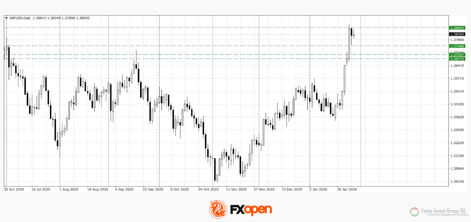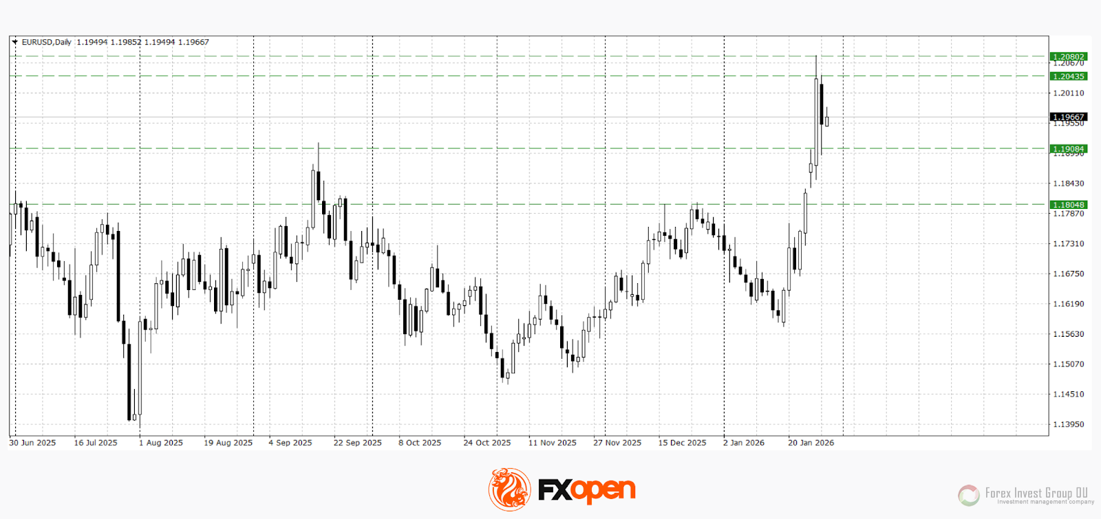 FxSignal 29-01-2026, 13:00 102 Аналитика, прогнозы валютного рынкаЕвро и фунт сохранили восходящую динамику после заседания ФРС, несмотря на то что ставка была оставлена без изменений. В начале недели обе пары резко выросли: EUR/USD протестировала область выше психологического уровня 1.2000, а GBP/USD поднималась к 1.3870, после чего последовала умеренная коррекция на фиксации прибыли.