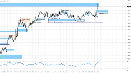 Пара EUR/USD в понедельник выполнила сильное падение на дно имбаланса 9, но к концу дня вернулась
