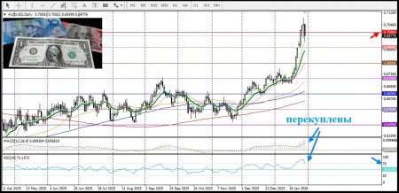 На фоне последних данных по ценам производителей инфляция в США остается устойчивой: годовой рост PPI в декабре оценивается рынком вблизи 3%, а базовый показатель - около 3,3%, указывая на сохраняющееся ценовое давление на уровне производителей.Комбинация факторов - мягкая коррекция после продолжительного роста AUD и частичное восстановление доллара США - приводит к локальному смещению баланса в пользу доллара и давит на пару AUD/USD на ближайший период времени. Тем не менее, с учетом более «ястребиного» ценового сценария по линии RBA и устойчивого внутреннего фундамента Австралии, касаемо благоприятных условий для денежно-кредитной политики, среднесрочные перспективы для австралийской валюты остаются конструктивными, а глубина текущей просадки может быть ограничена покупками на снижении.