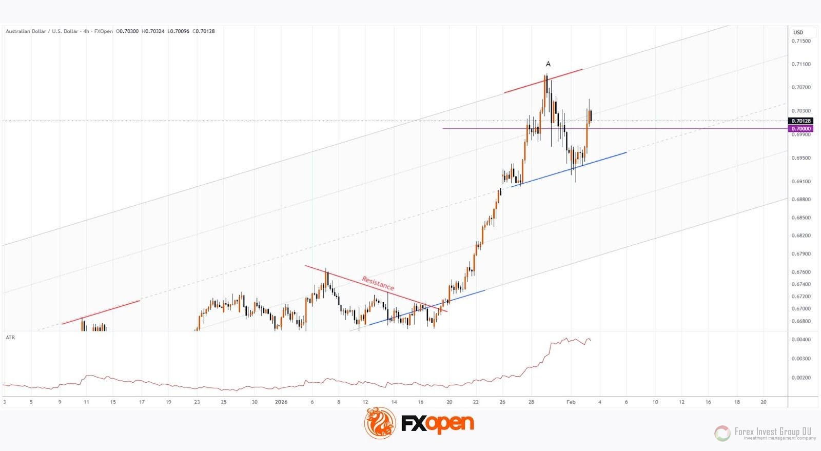 FxSignal 3-02-2026, 15:00 106 Аналитика, прогнозы валютного рынкаКак свидетельствует график AUD/USD, сегодня курс австралийского доллара закрепляется выше психологической отметки 0.700 после бычьего импульса, ставшего реакцией рынка на решение Резервного банка Австралии (RBA), который поднял процентную ставку Cash Rate с 3.60% до 3.85%.
