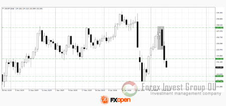 Технический анализ USD/JPY указывает на возможность теста январских экстремумов вблизи 152.20 - 152.70, так как на дневном таймфрейме сформирована комбинация “медвежье поглощение”. Отменой нисходящего сценария станет закрепление выше 154.50.